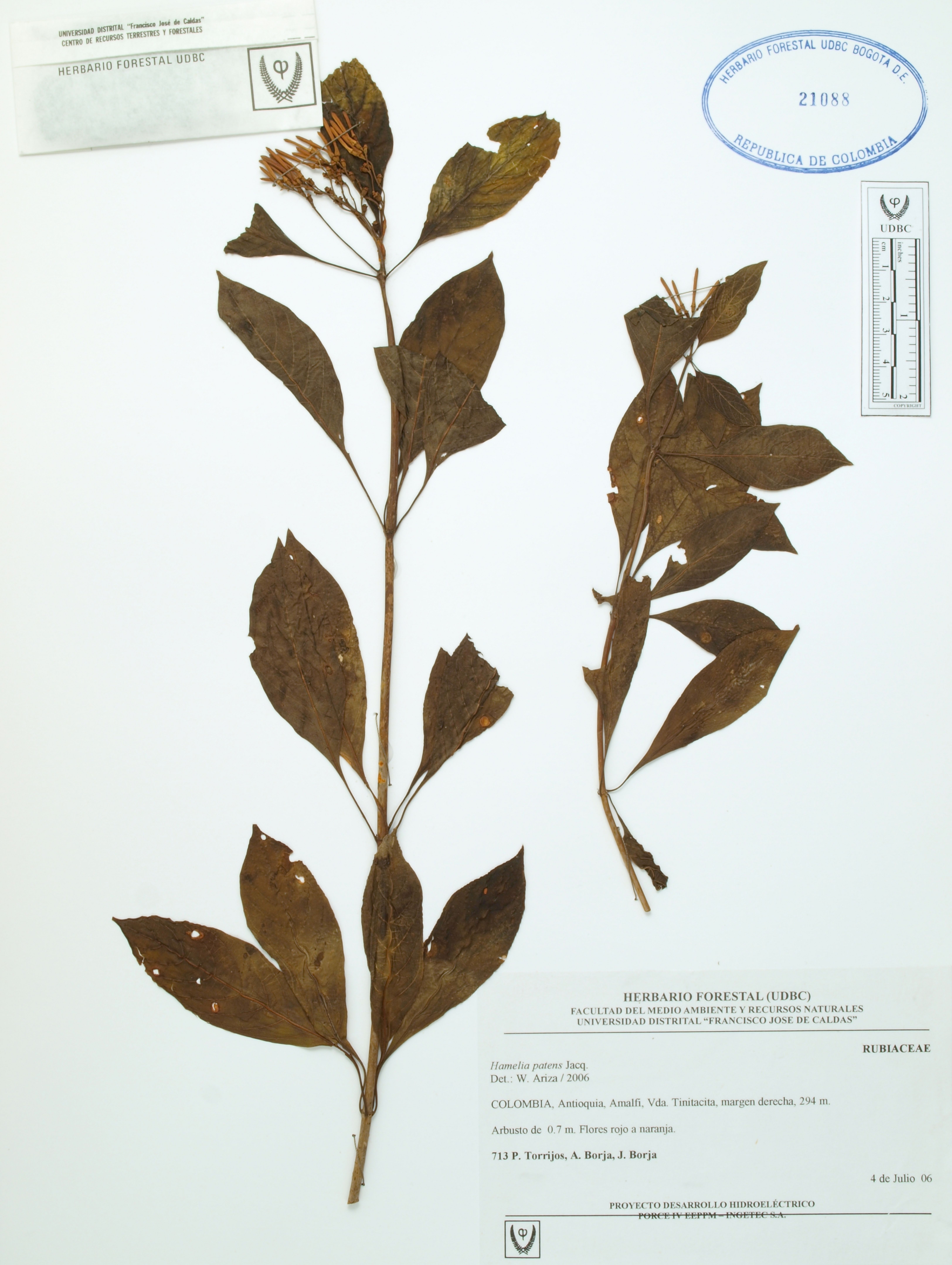 Fotografía del ejemplar Torrijos, P. 713, determinado como Hamelia patens en el año 2006