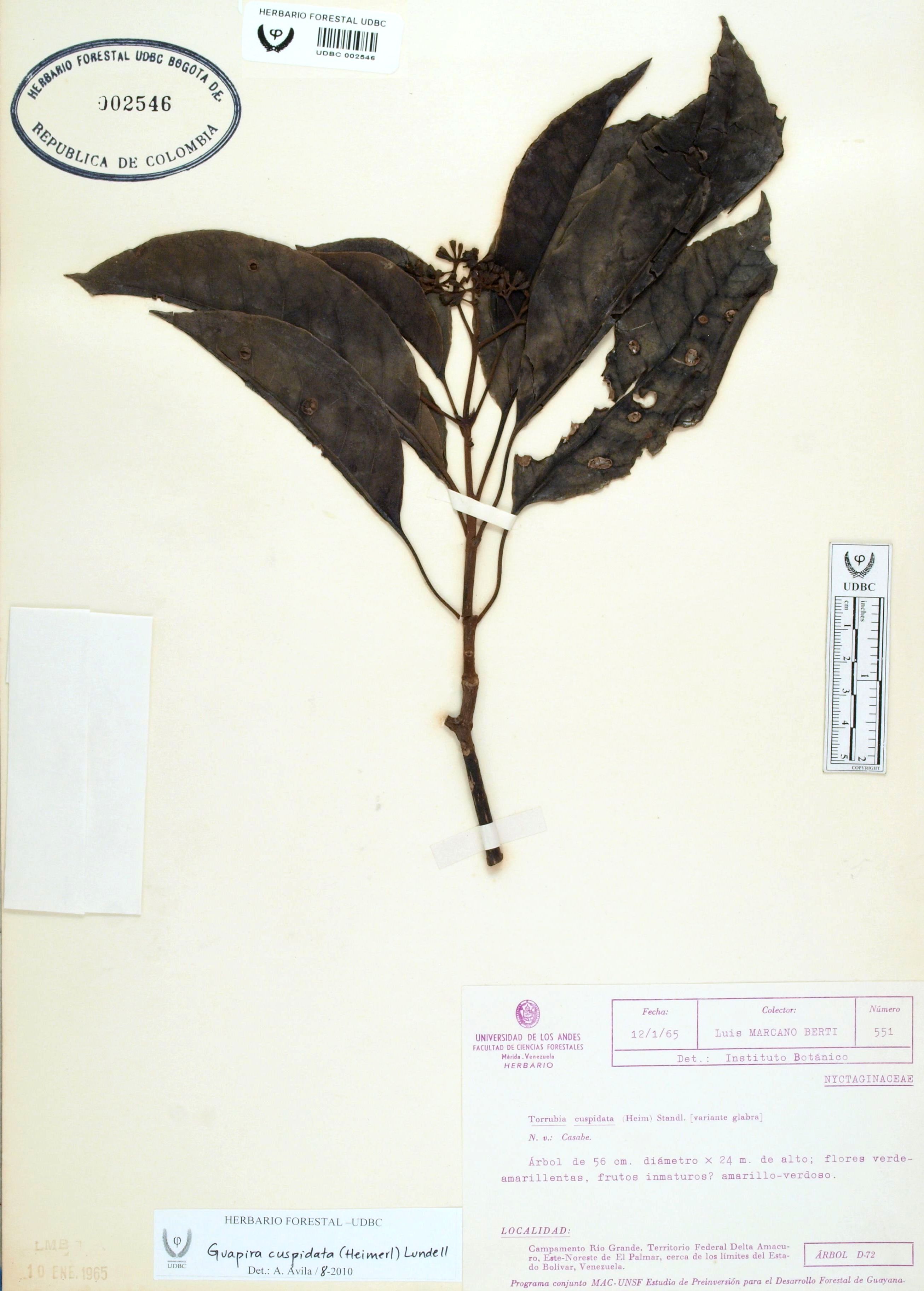 Fotografía del ejemplar Marcano, L. 551, determinado como Guapira cuspidata en el año 2010