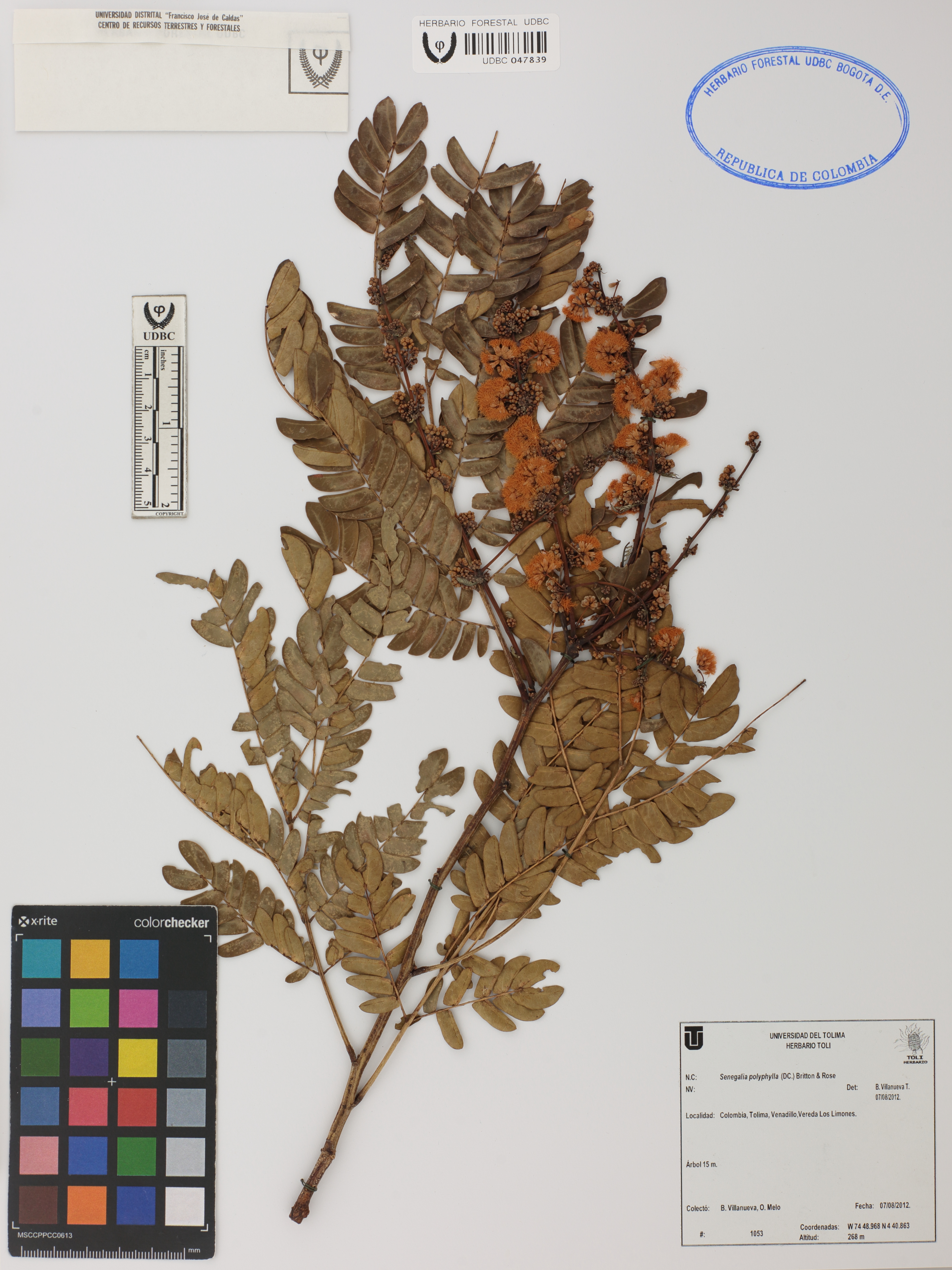Fotografía del ejemplar Villanueva, B. 1053, determinado como Senegalia polyphylla en el año 2012