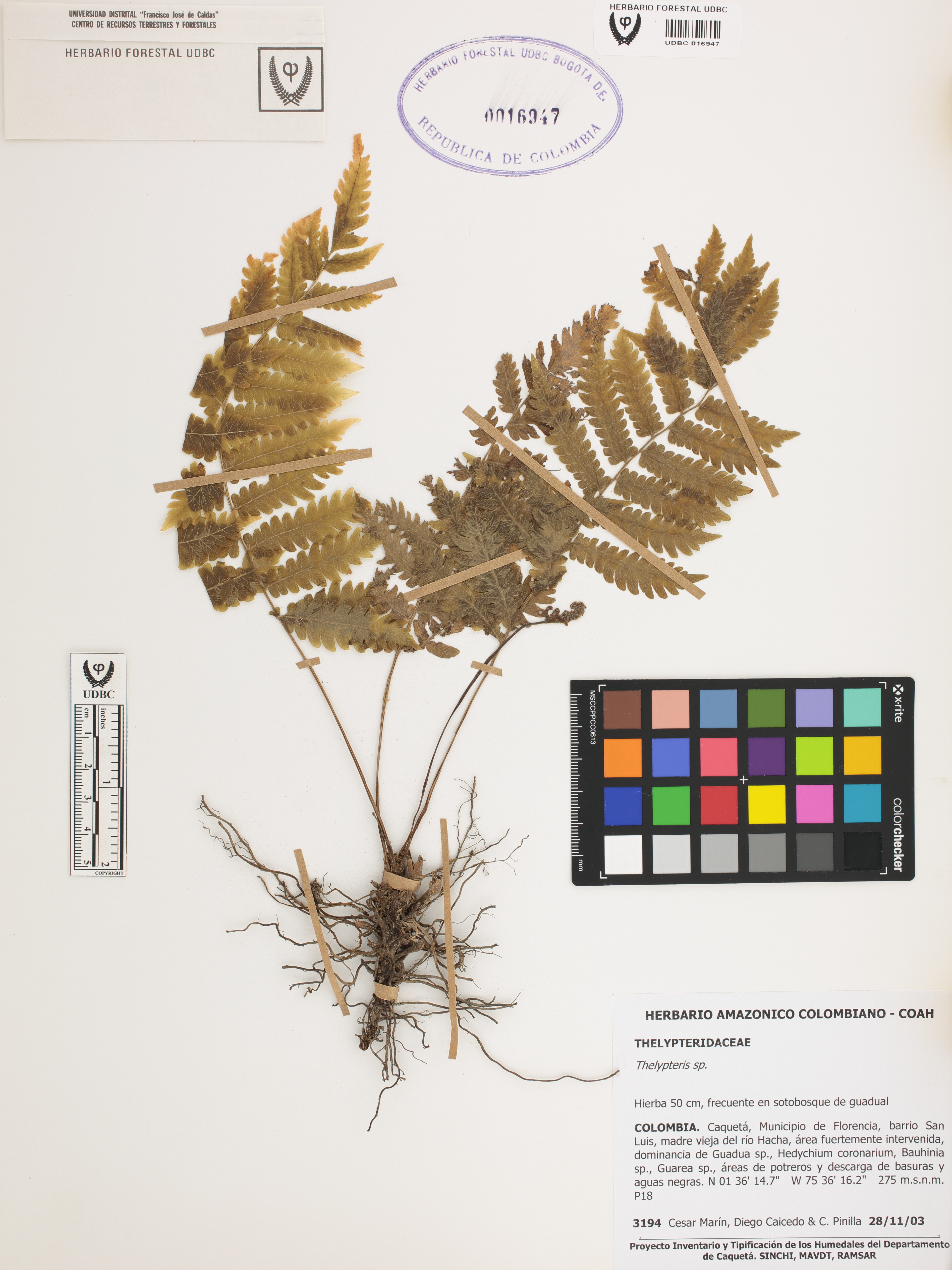 Fotografía del ejemplar Marín, C. 3194, determinado como Thelypteris sp.