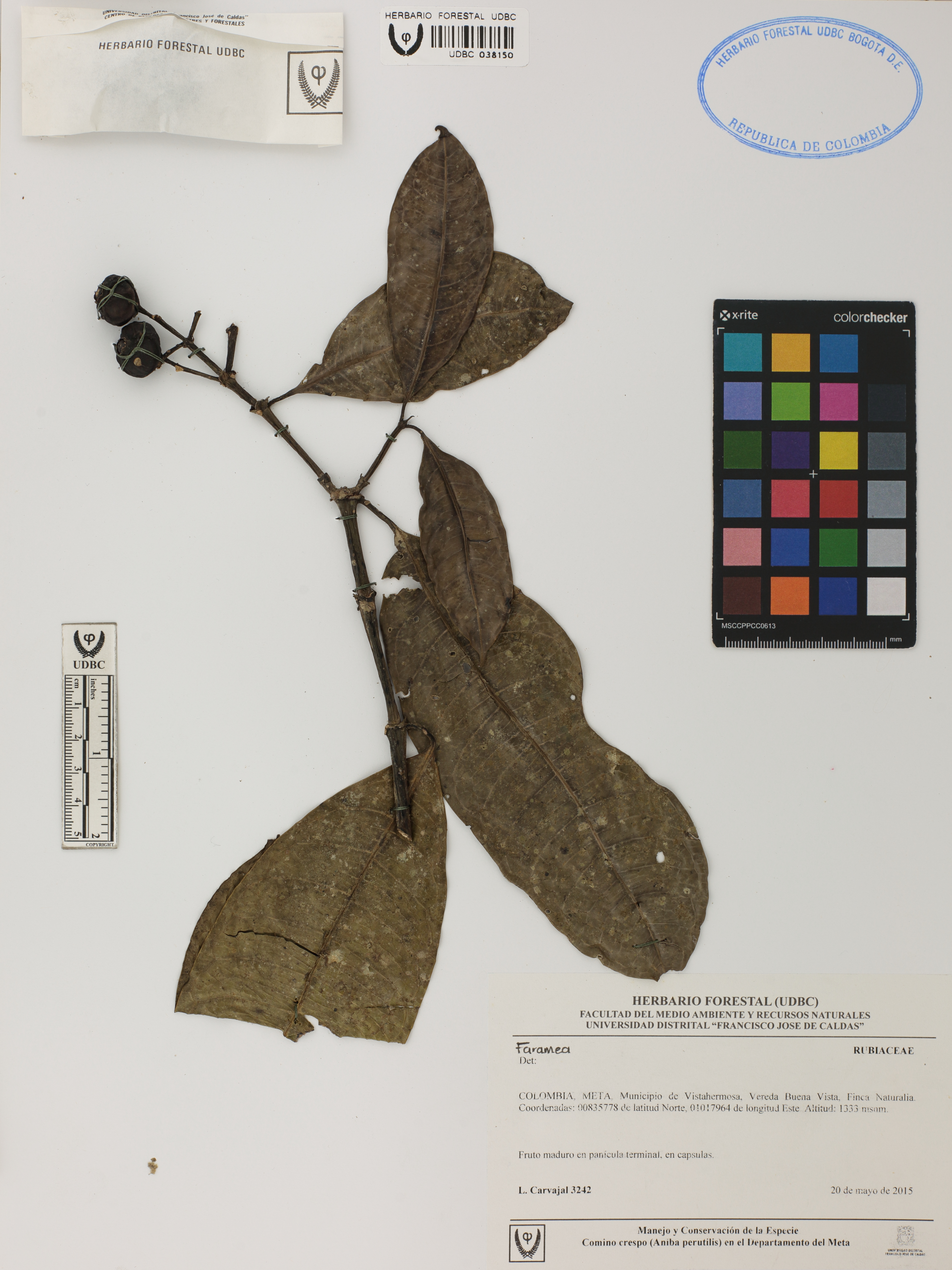 Fotografía del ejemplar Carvajal, L. 3242, determinado como Faramea sp.