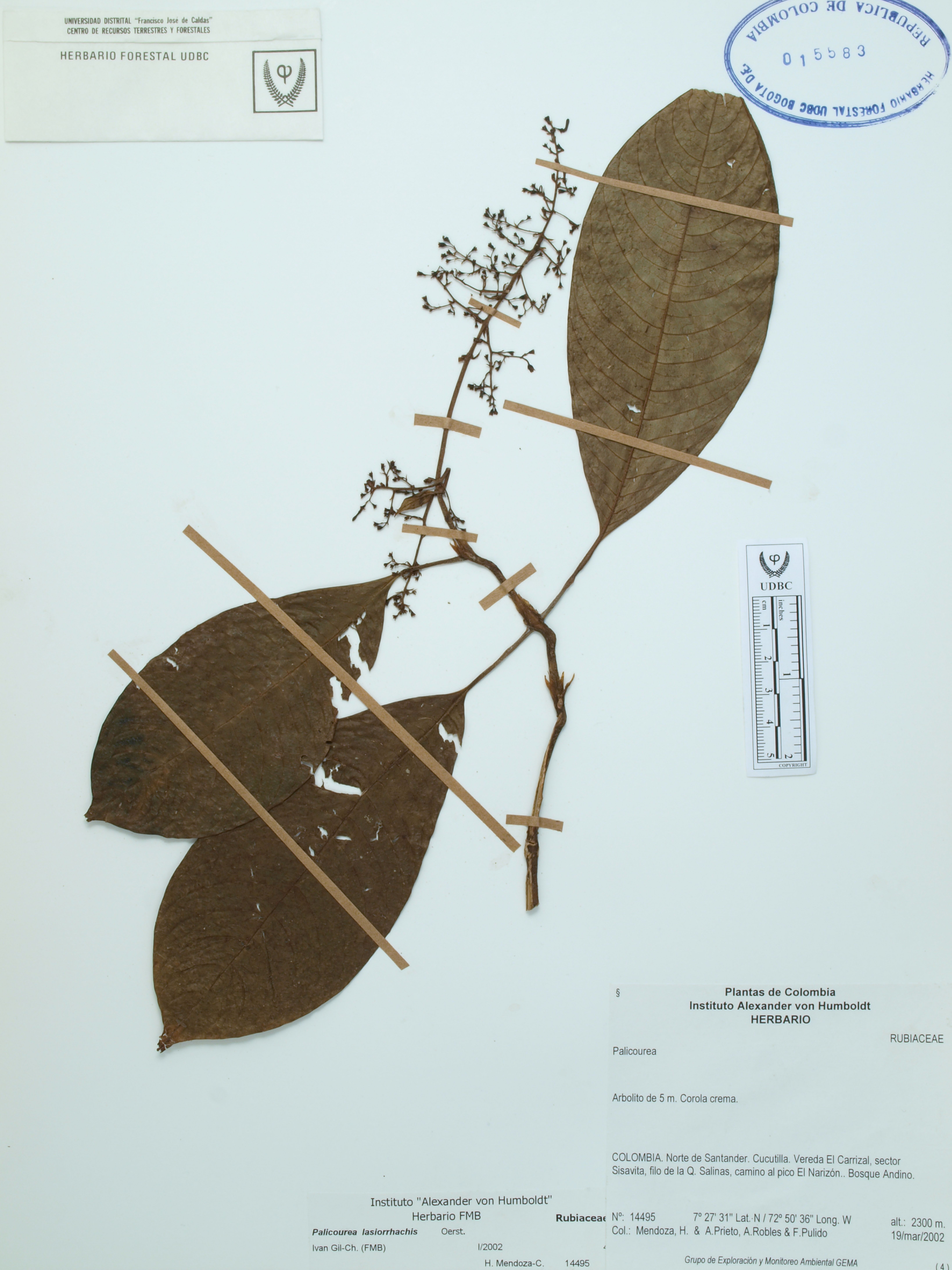 Fotografía del ejemplar Mendoza, H. 14495, determinado como Palicourea lasiorrhachis en el año 2002