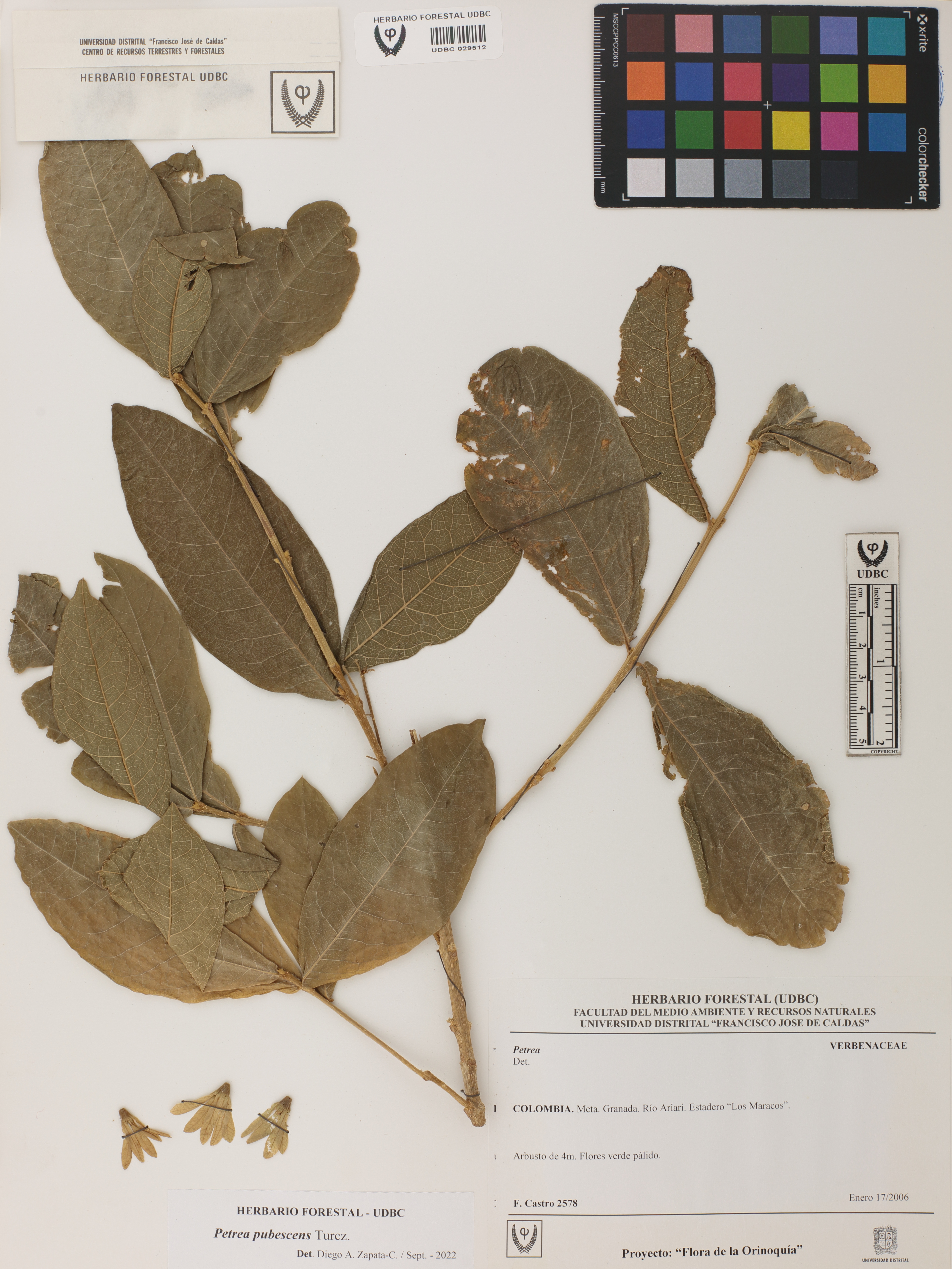 Fotografía del ejemplar Castro, F. 2578, determinado como Petrea pubescens en el año 2022