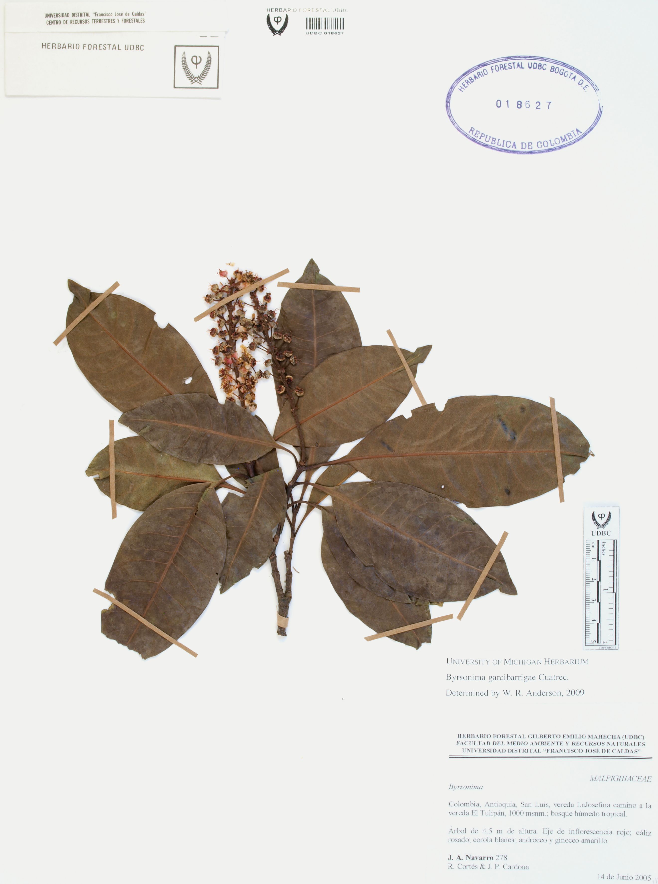 Fotografía del ejemplar Navarro, J. 278, determinado como Byrsonima garcibarrigae en el año 2009