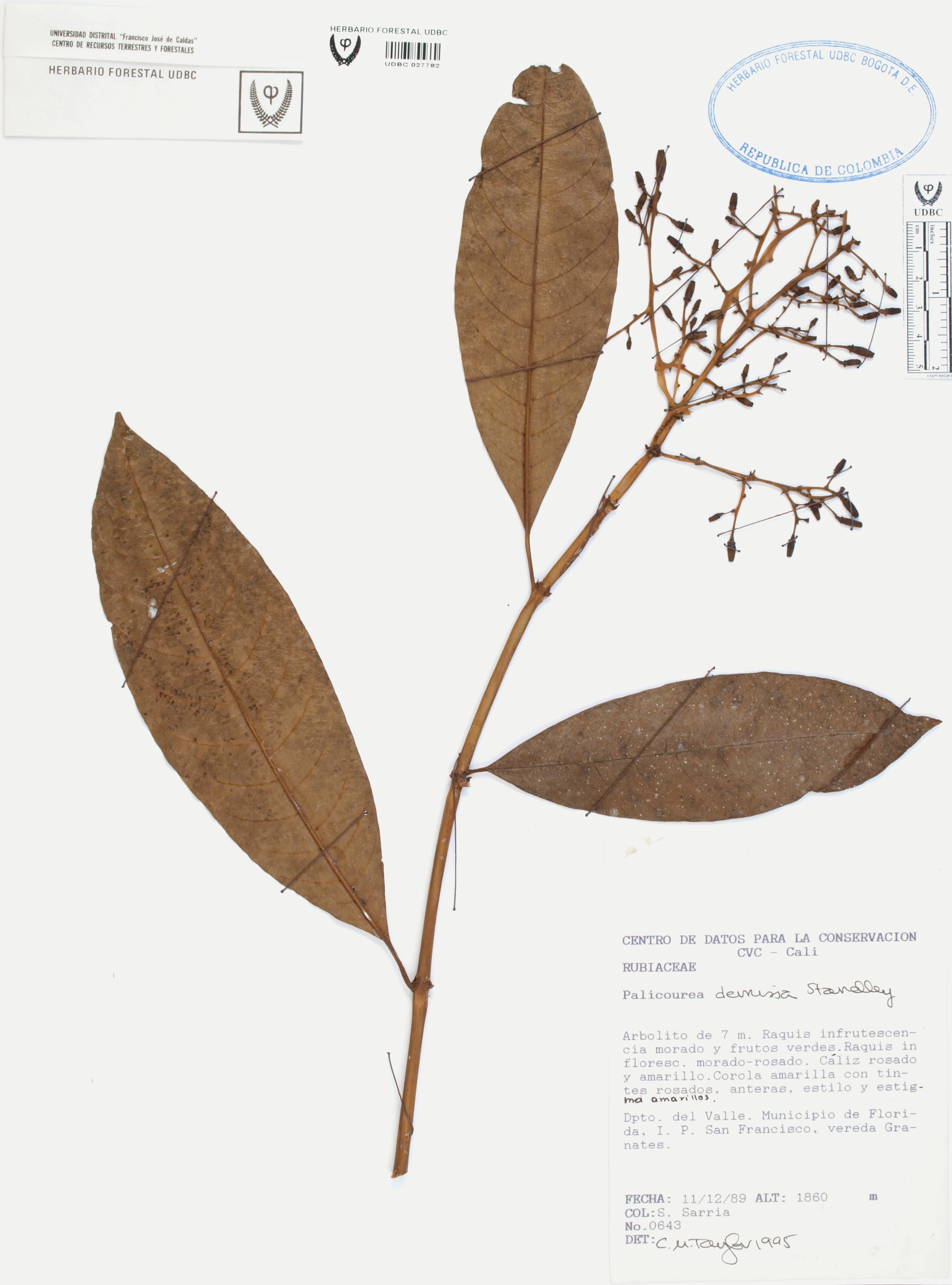 Fotografía del ejemplar Sarria, S. 643, determinado como Palicourea demissa en el año 1995