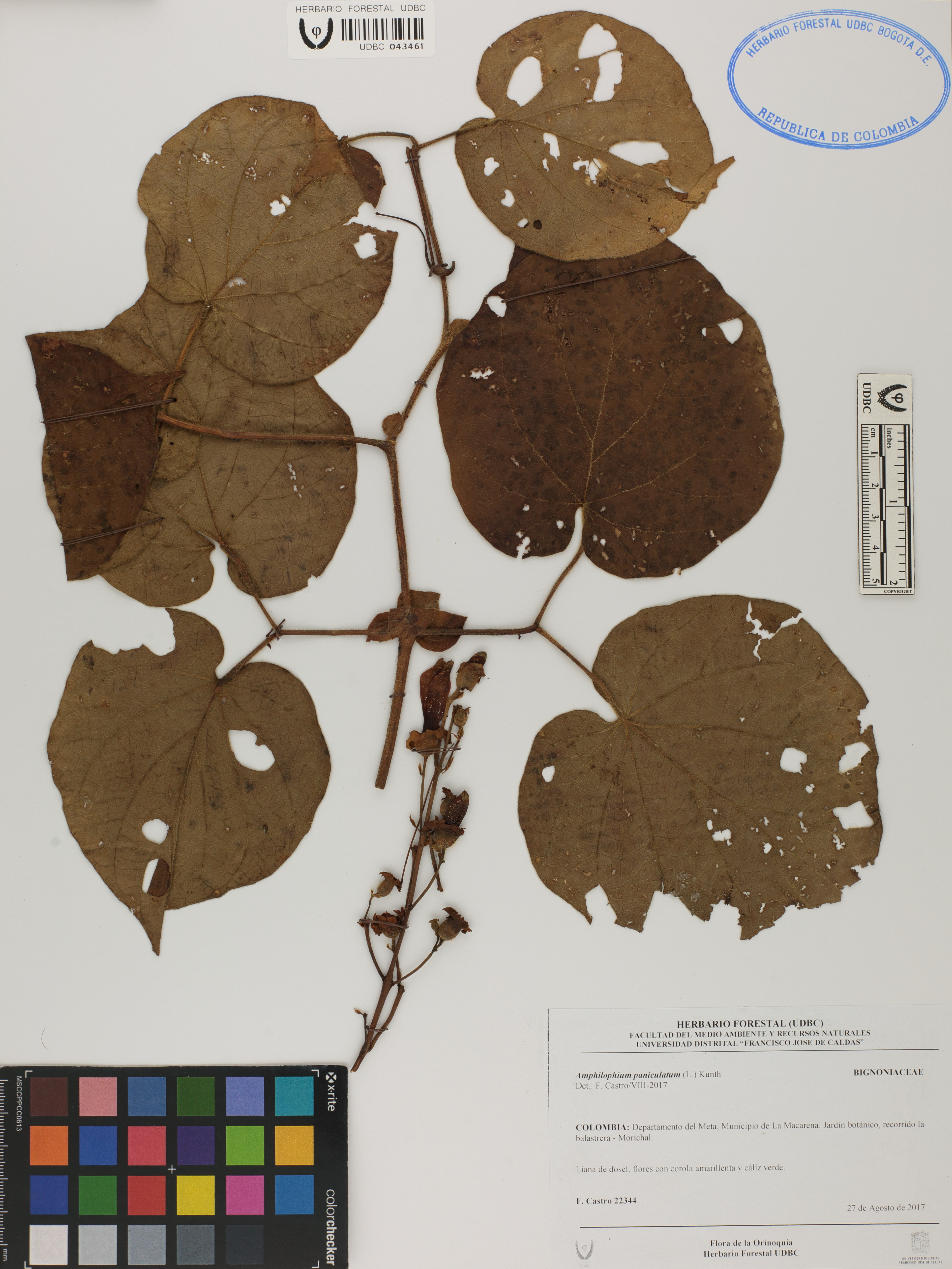 Fotografía del ejemplar Castro, F. 22344, determinado como Amphilophium paniculatum en el año 2017