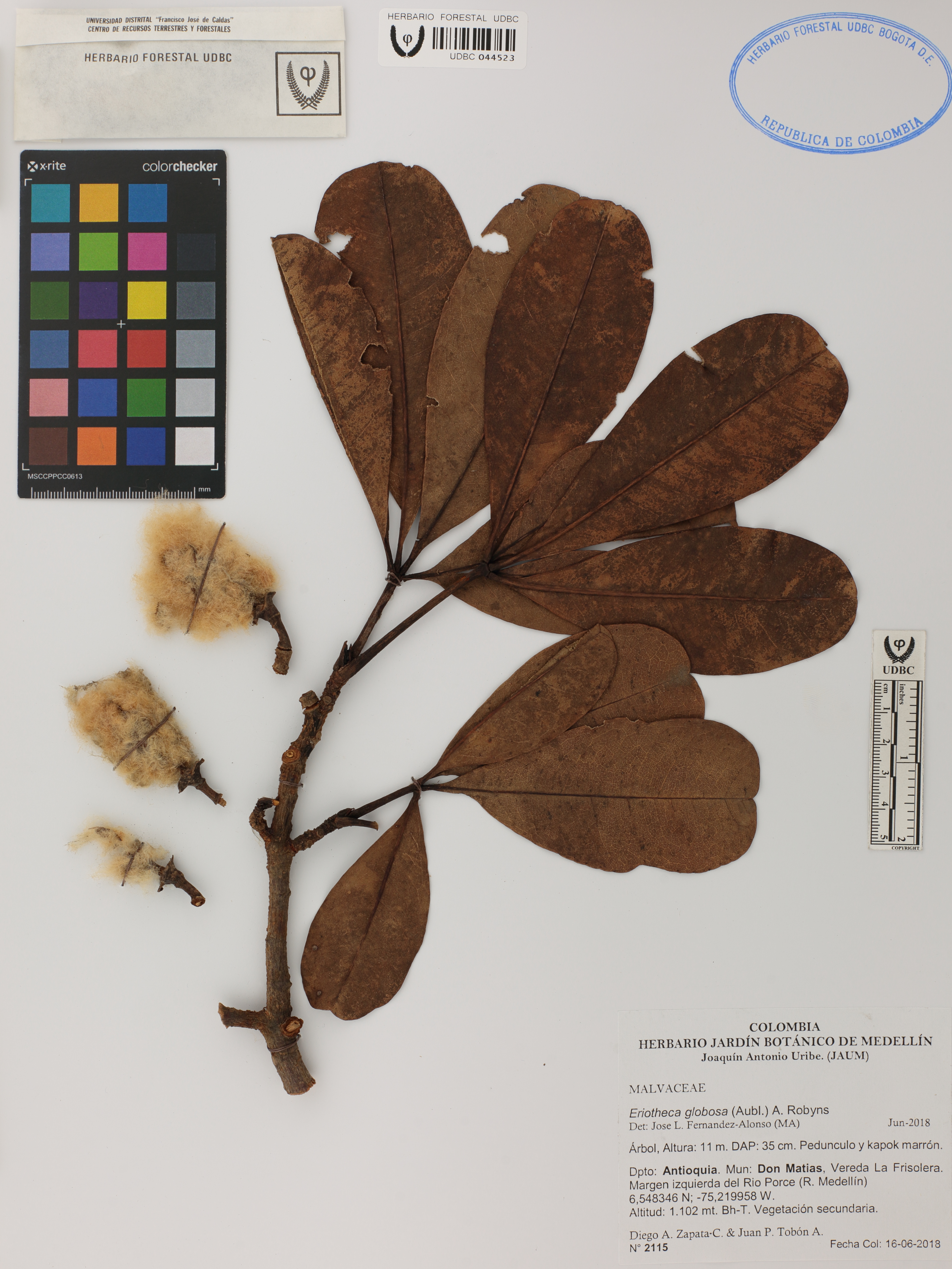Fotografía del ejemplar Zapata-C., D. 2115, determinado como Eriotheca globosa en el año 2018