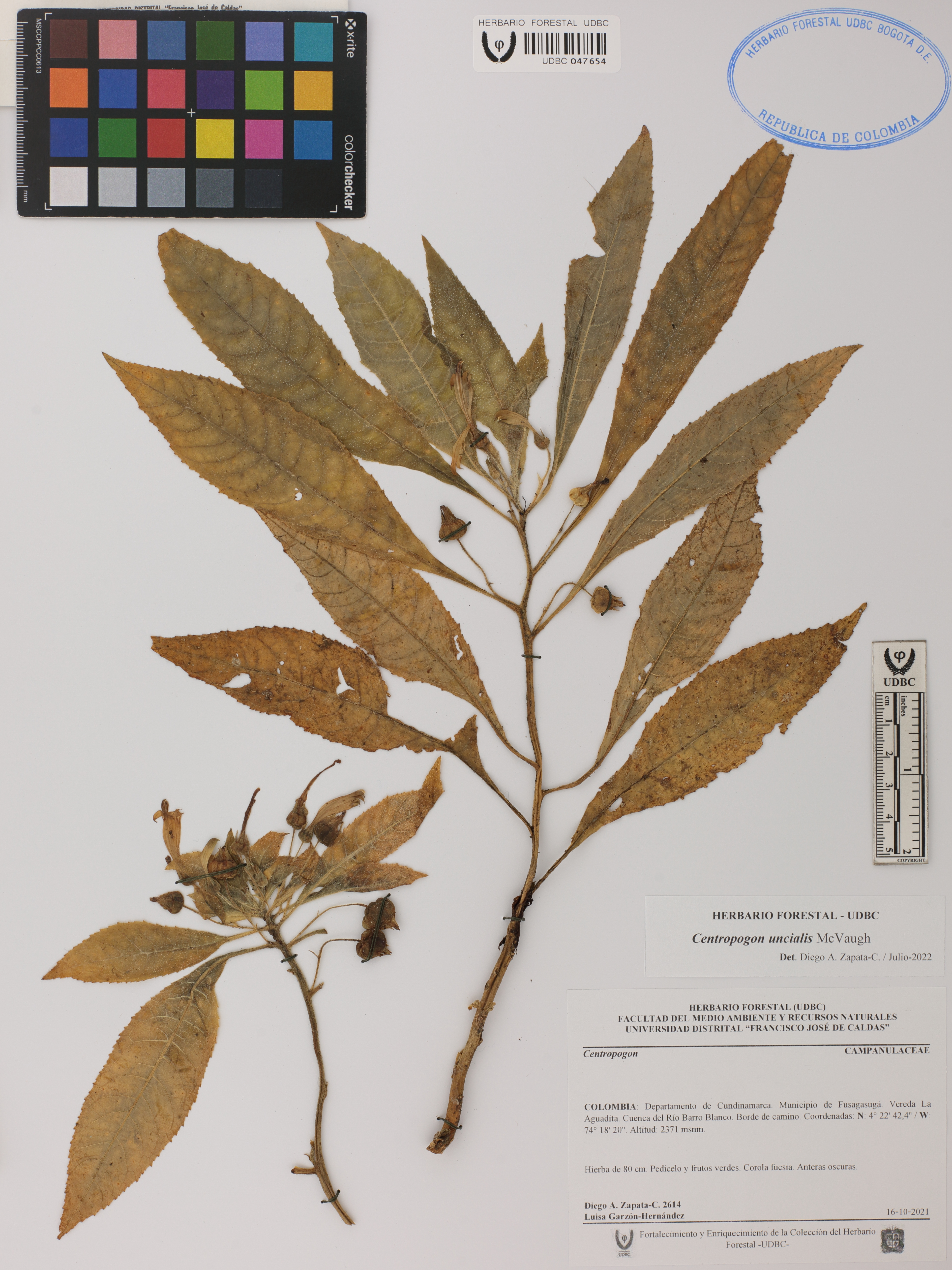 | dc.description | Fotografía del ejemplar Zapata-C., D. 2614, determinado como Centropogon uncialis en el año 2022 | |
