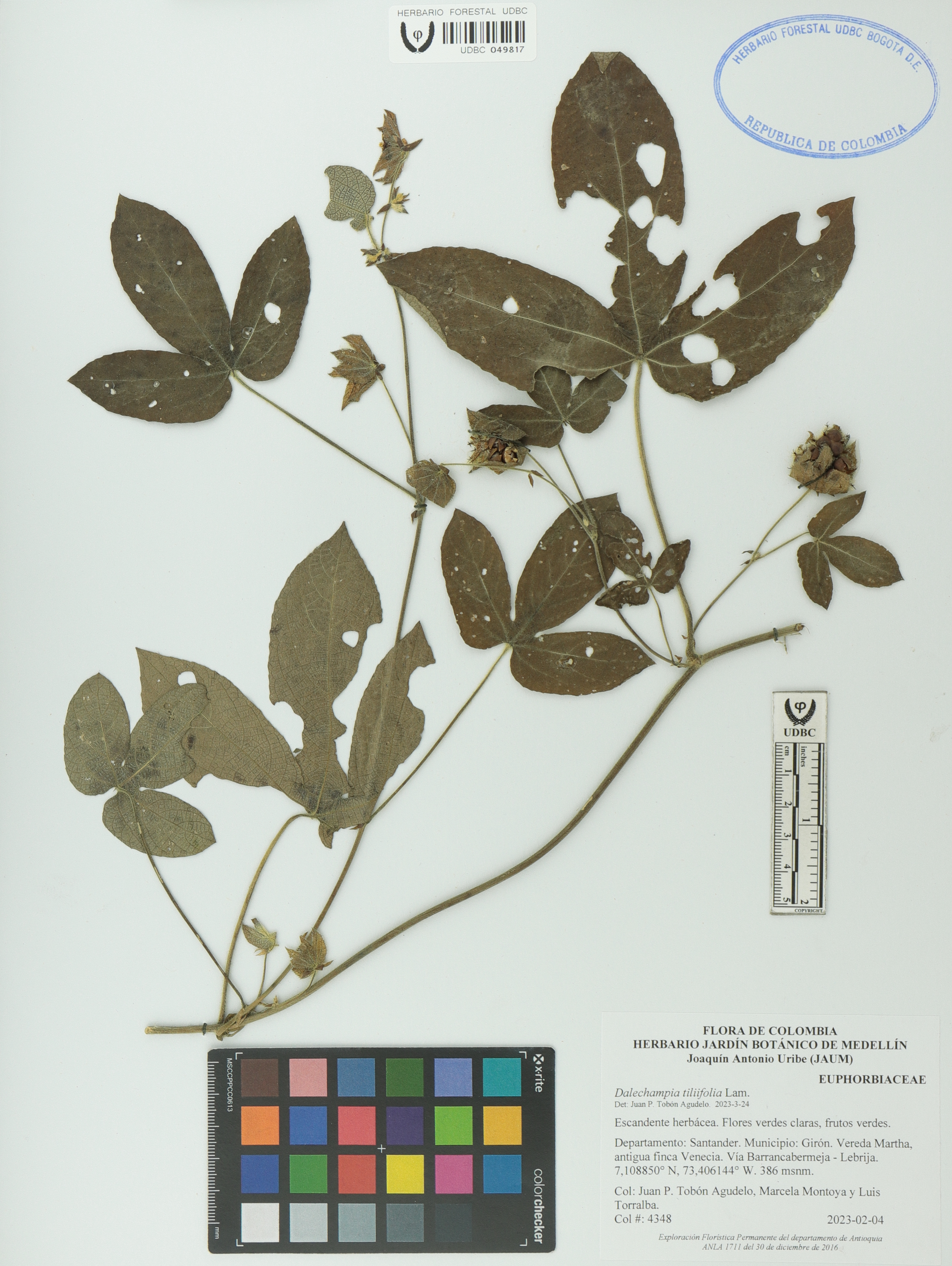 | dc.description | Fotografía del ejemplar Tobón-A., J. 4348, determinado como Dalechampia tiliifolia en el año 2023 | |