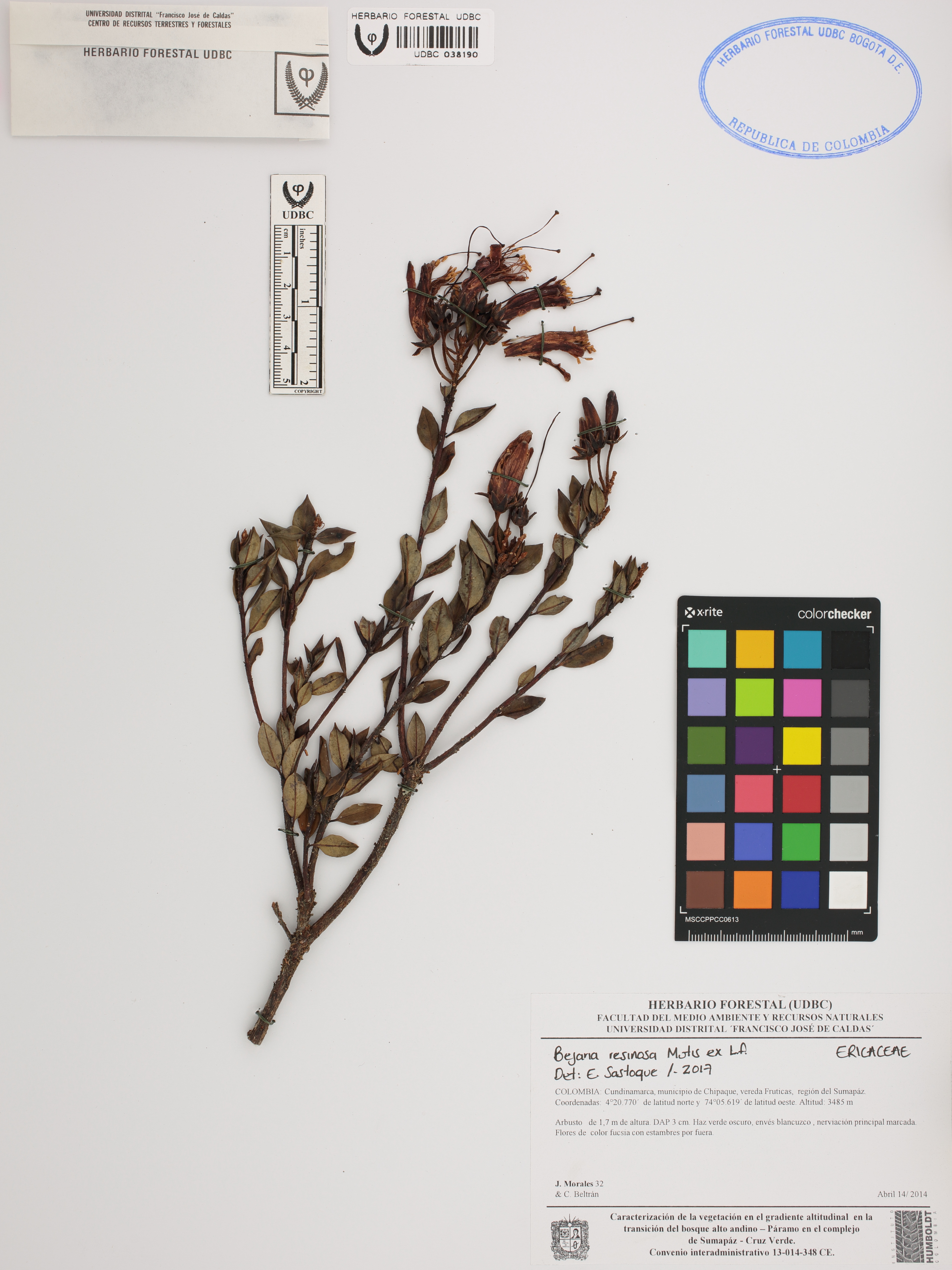 Fotografía del ejemplar Morales, J. 32, determinado como Bejaria resinosa en el año 2017