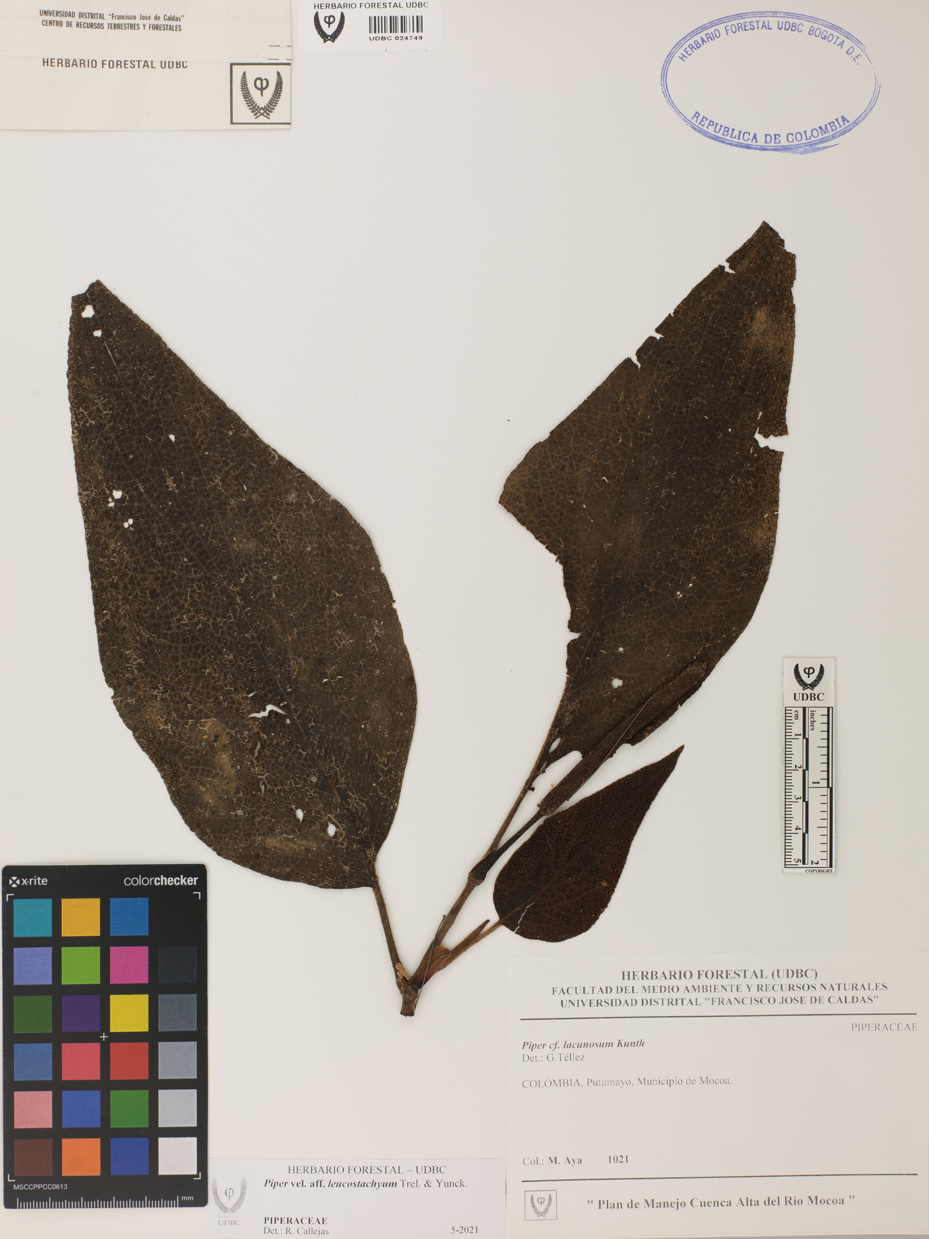 Fotografía del ejemplar Aya, M. 1021, determinado como Piper leucostachyum en el año 2021