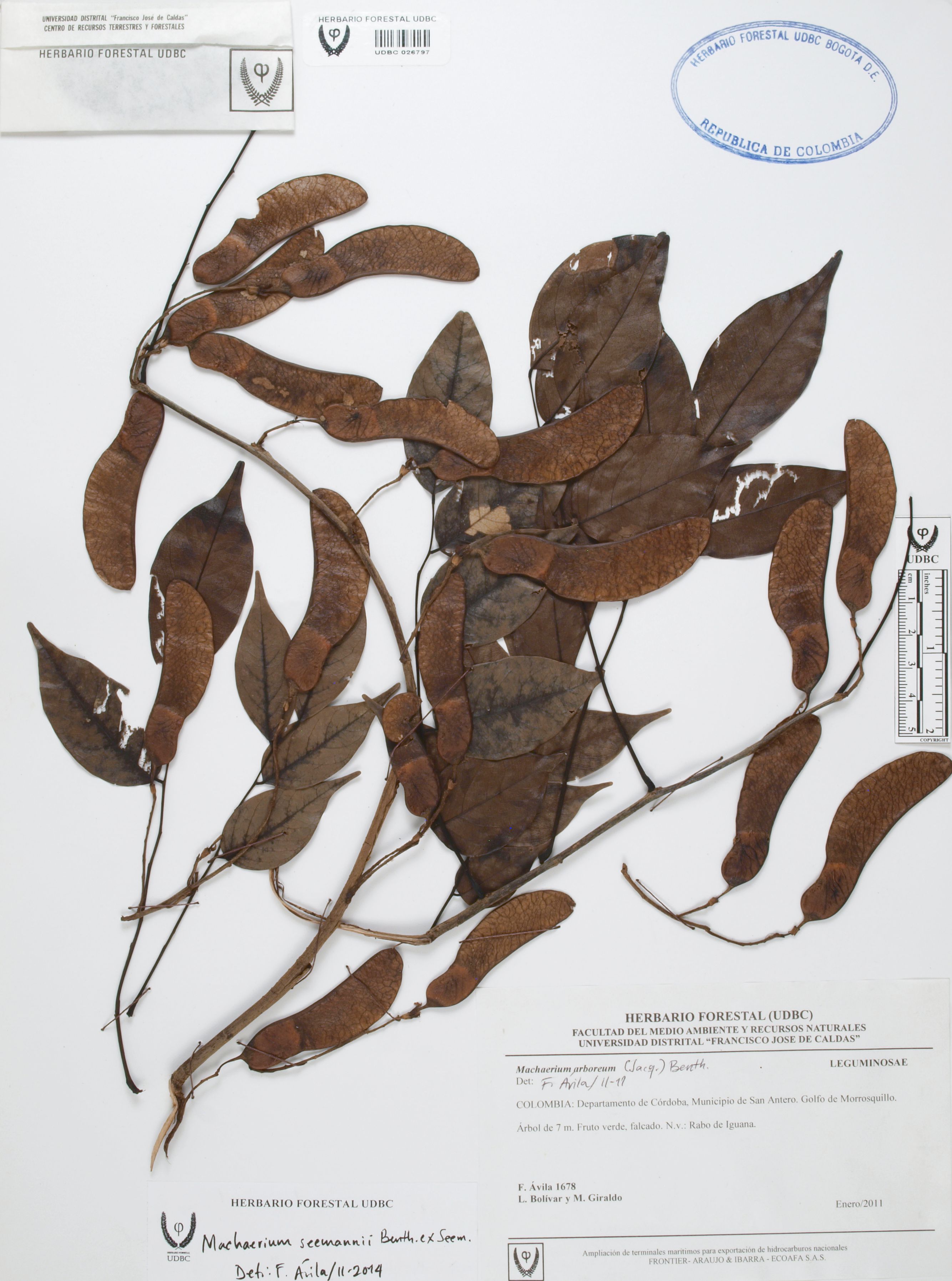 Fotografía del ejemplar Ávila, F. 1678, determinado como Machaerium arboreum en el año 2011