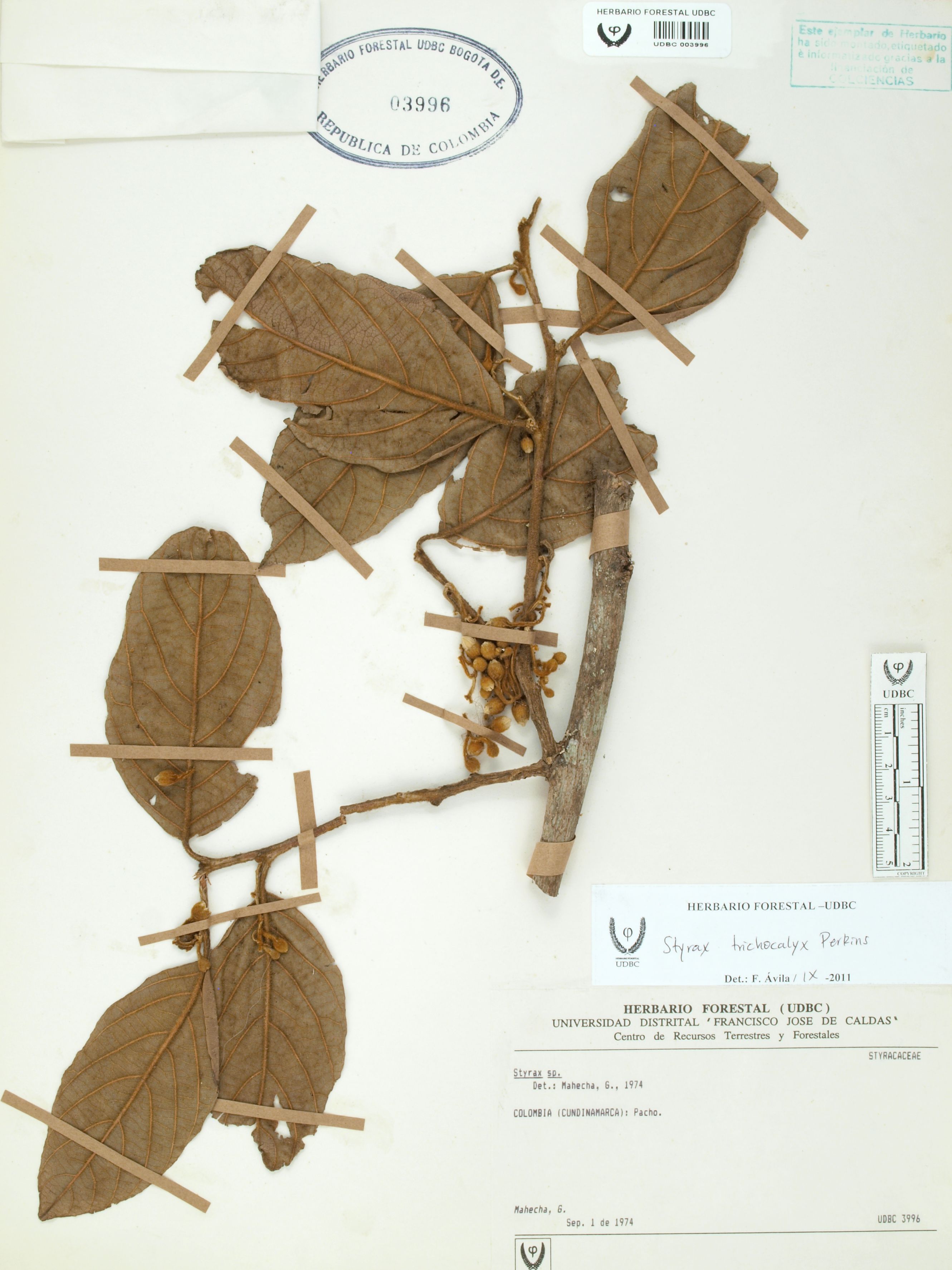 Fotografía del ejemplar Mahecha, G., determinado como Styrax trichocalyx en el año 2011