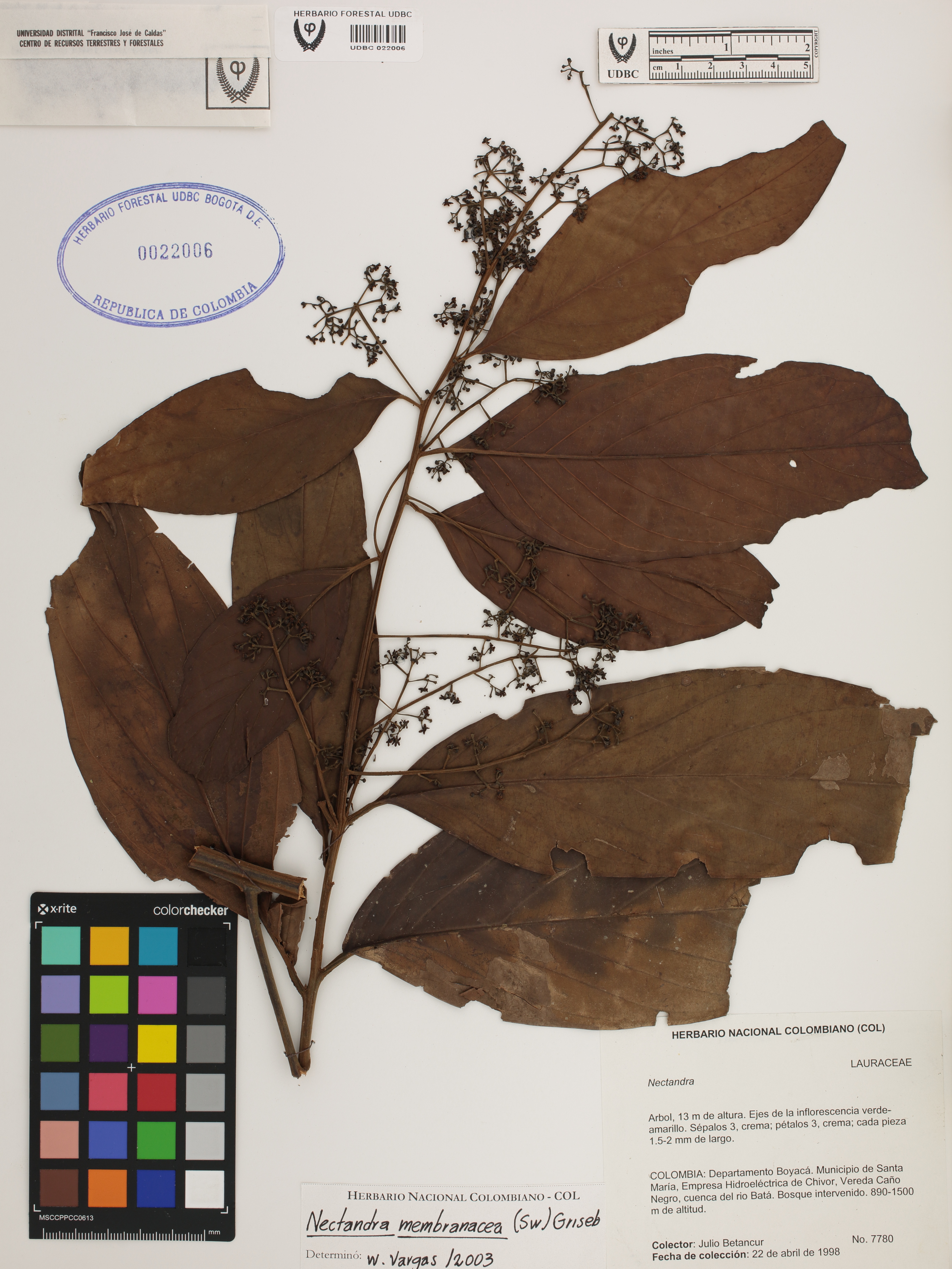 Fotografía del ejemplar Betancur, J. 7780, determinado como Nectandra membranacea en el año 2003