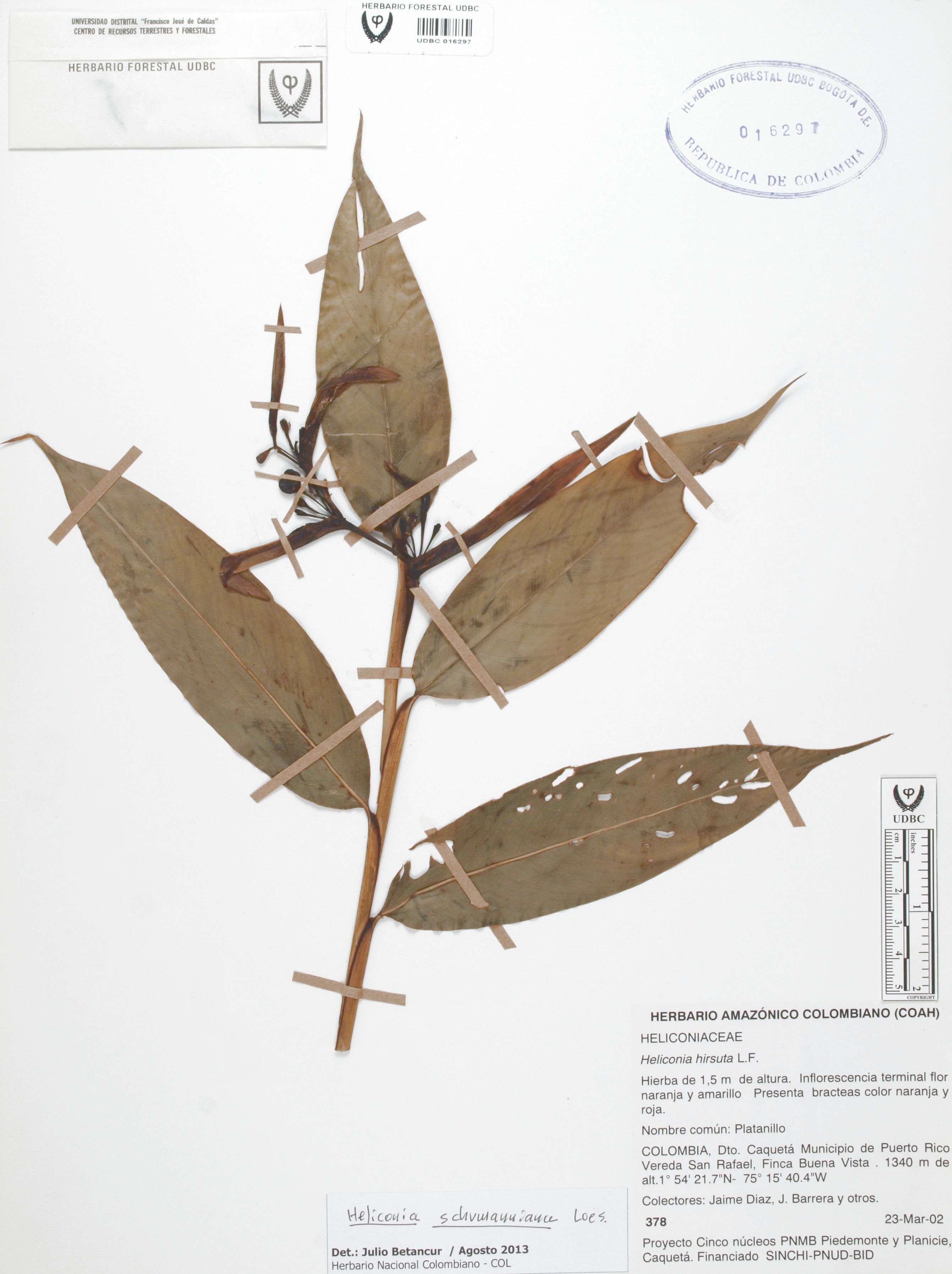 | dc.description | Fotografía del ejemplar Díaz, J. 378, determinado como Heliconia schumanniana en el año 2013 | |