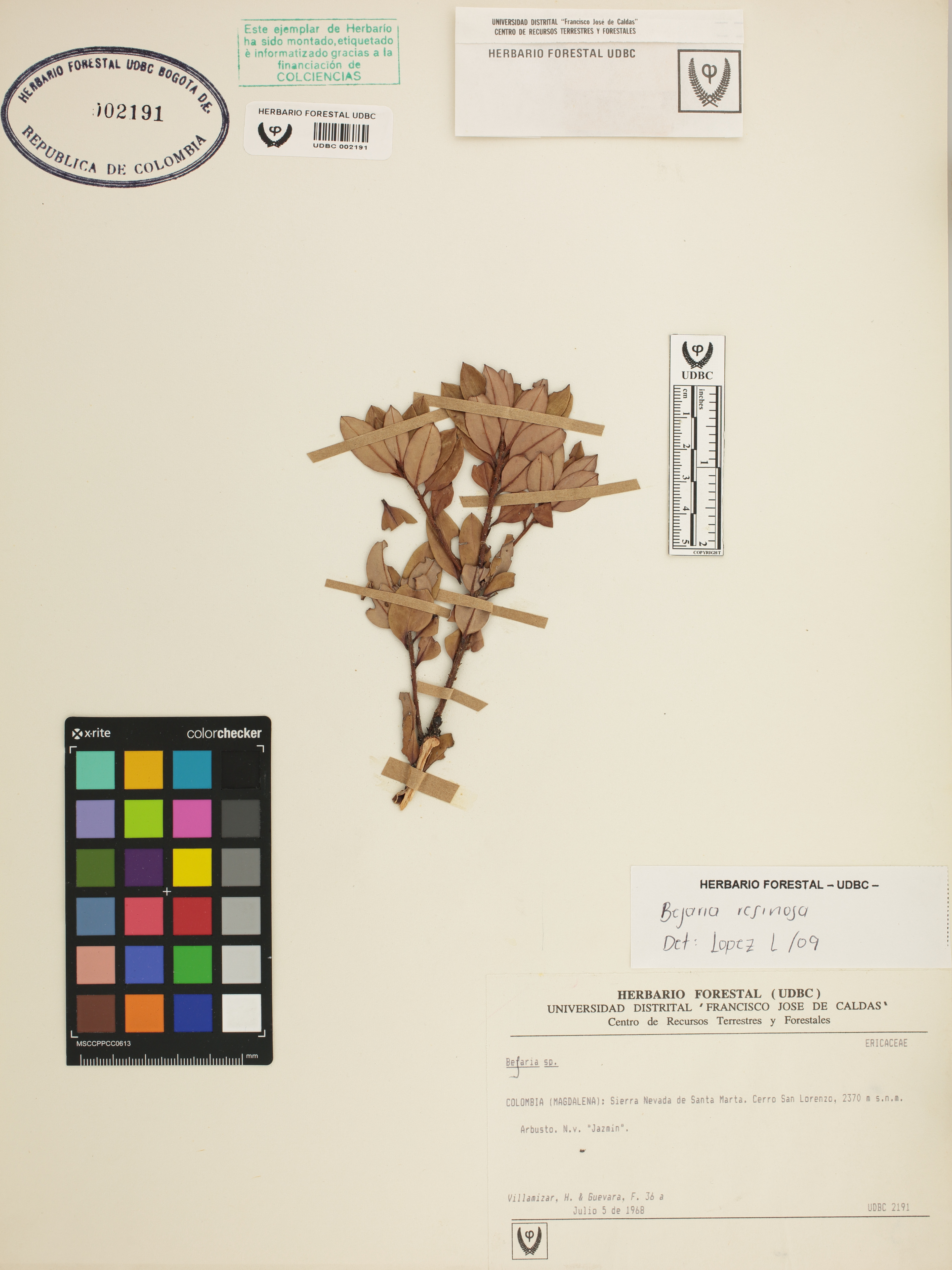 Fotografía del ejemplar Villamizar, H. 36 a, determinado como Bejaria resinosa en el año 2009