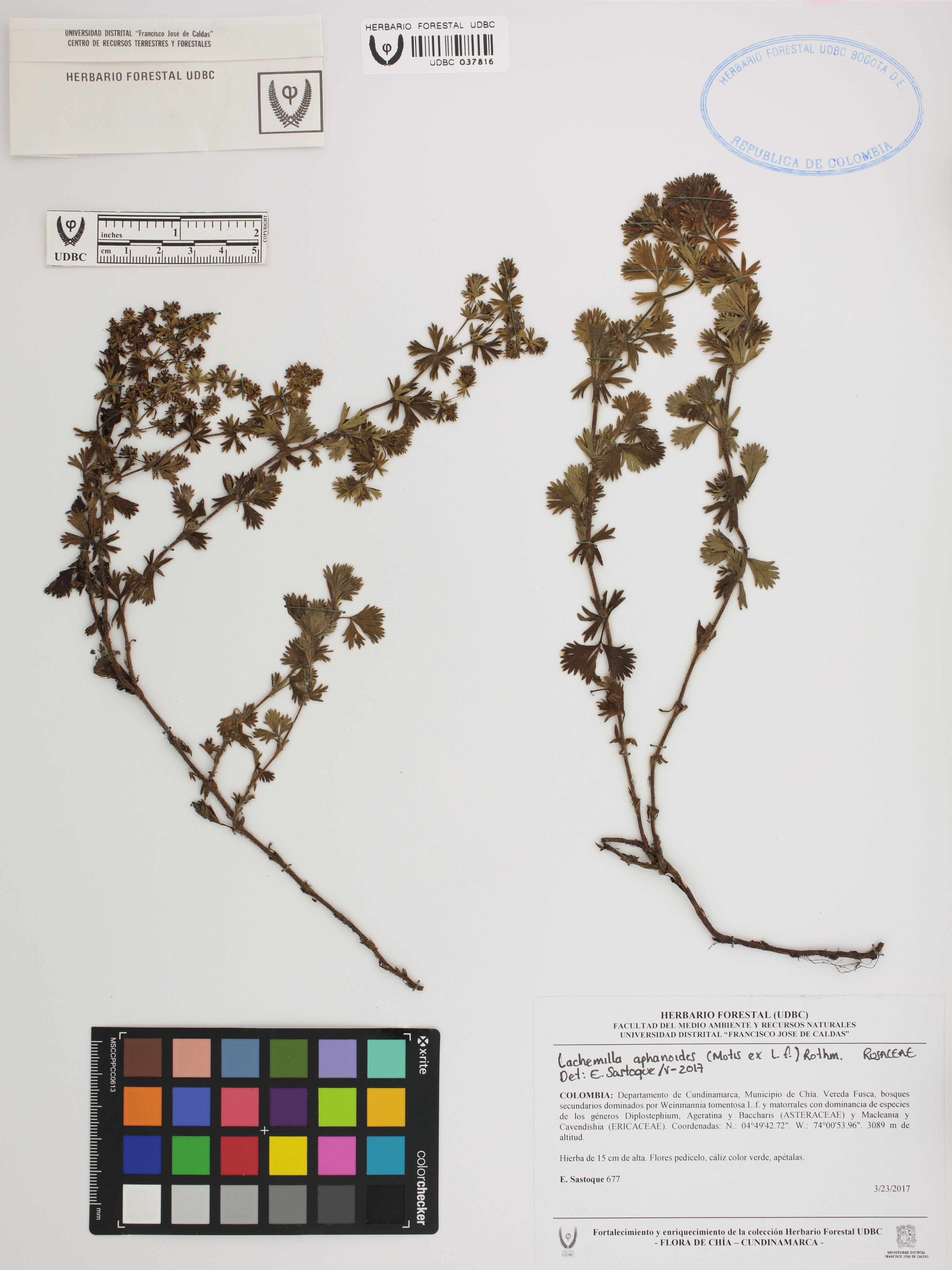 Fotografía del ejemplar Sastoque, E. 677, determinado como Lachemilla aphanoides en el año 2017
