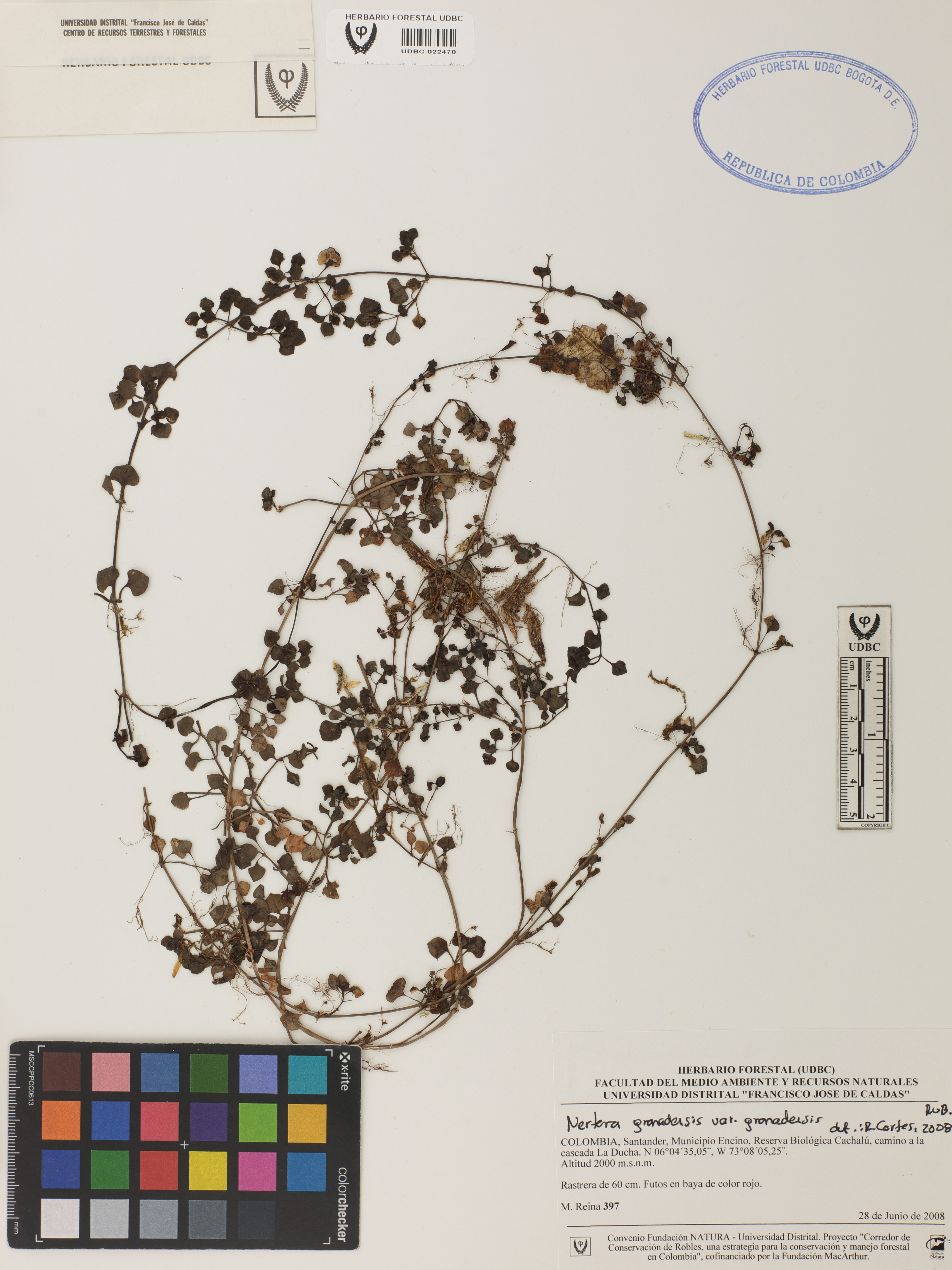 Fotografía del ejemplar Reina, M. 397, determinado como Nertera granadensis var. granadensis en el año 2008