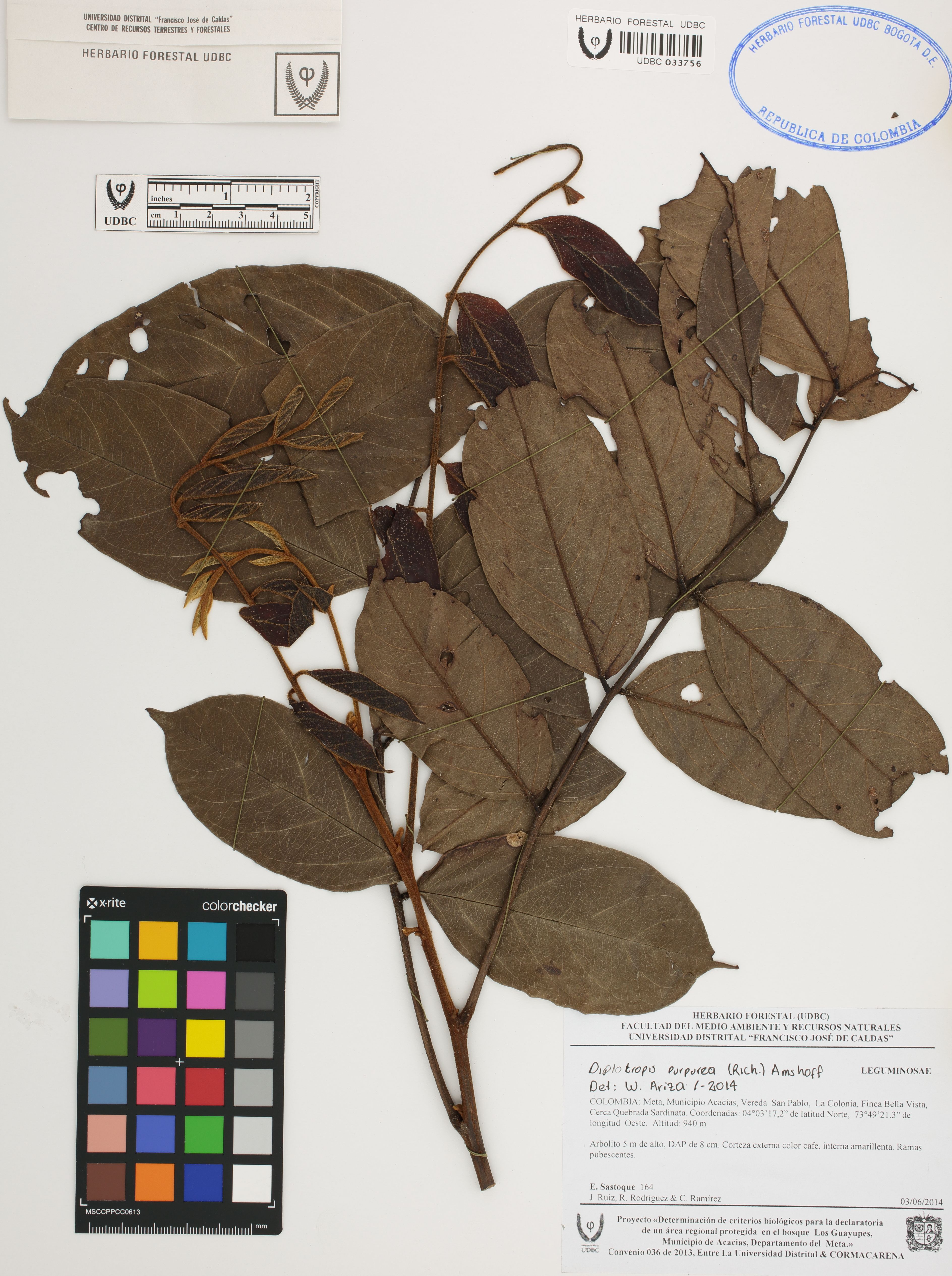 Fotografía del ejemplar Sastoque, E. 164, determinado como Diplotropis purpurea en el año 2014