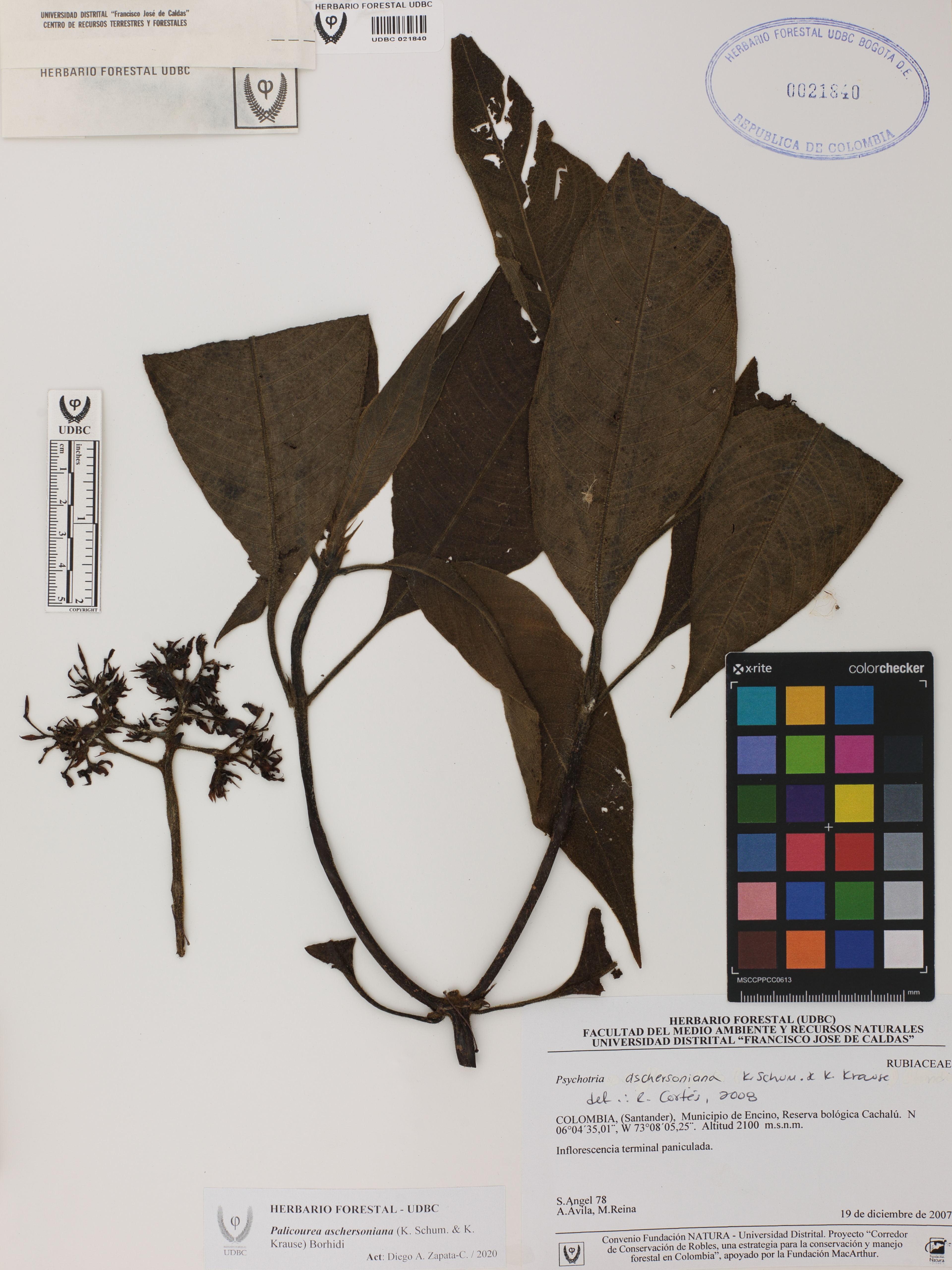 Fotografía del ejemplar Ángel, S. 78, determinado como Palicourea aschersoniana en el año 2008