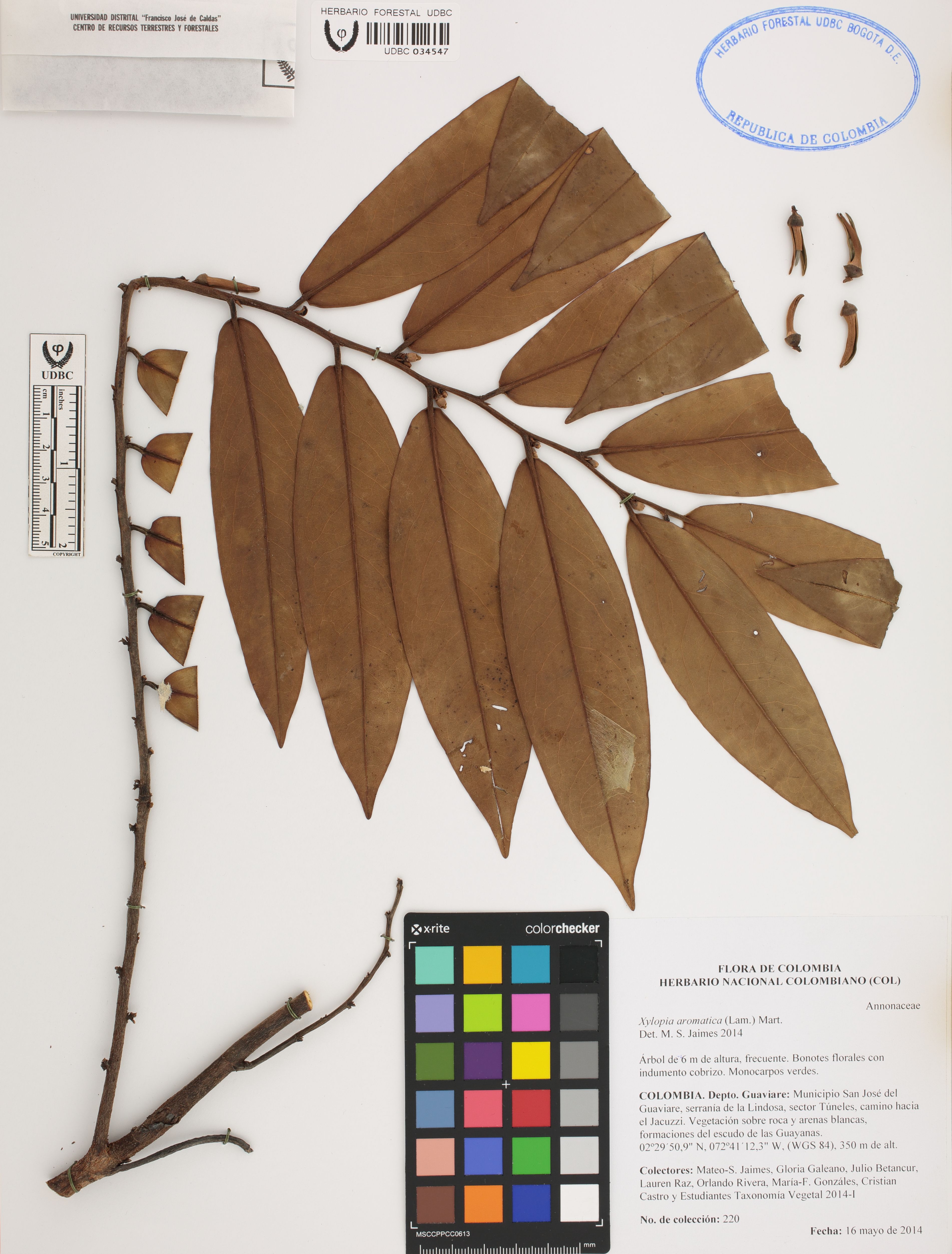 Fotografía del ejemplar Jaimes, M. 220, determinado como Xylopia aromatica en el año 2014