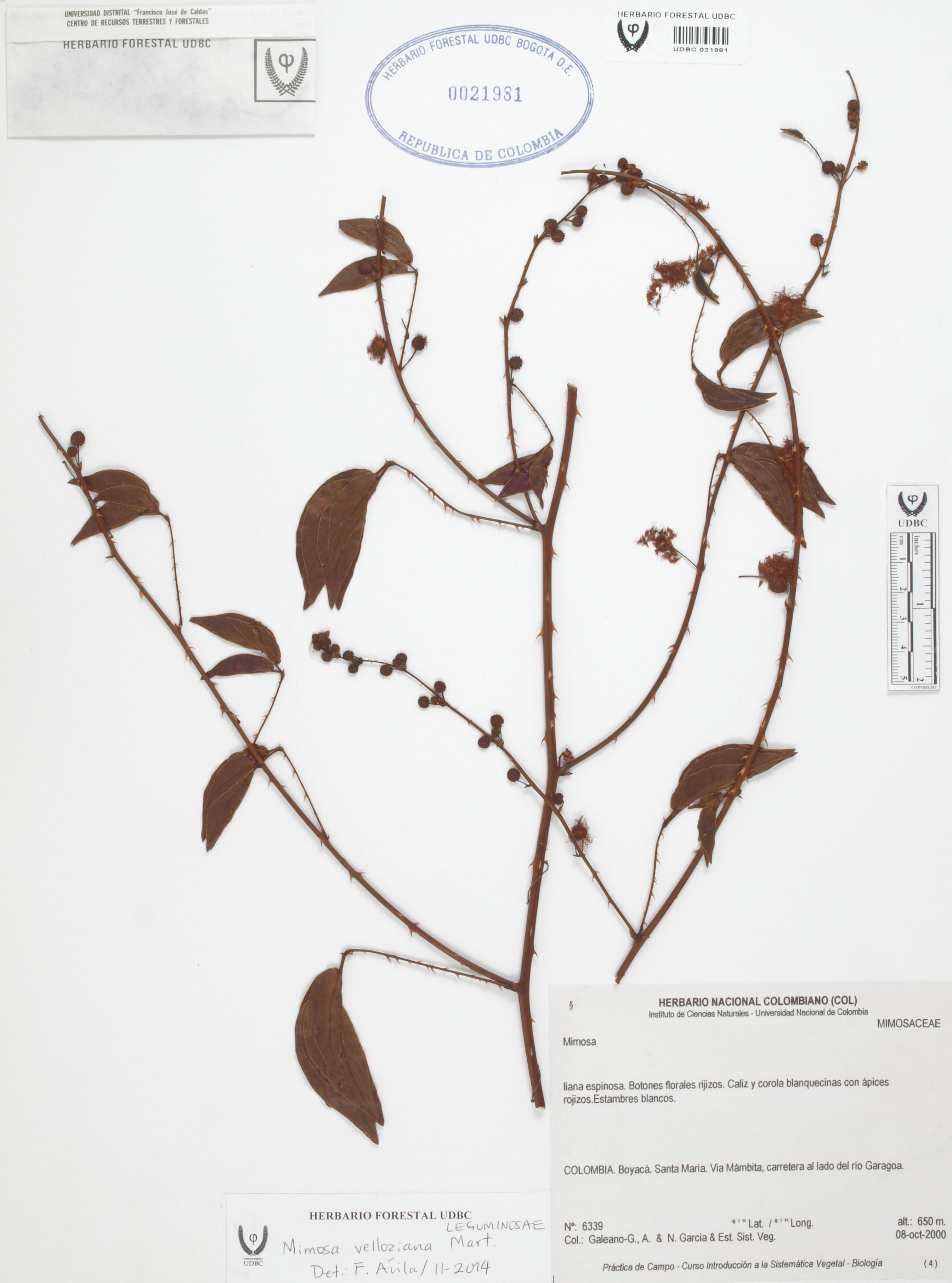| dc.description | Fotografía del ejemplar Galeano-G., A. 6339, determinado como Mimosa velloziana en el año 2014 | |