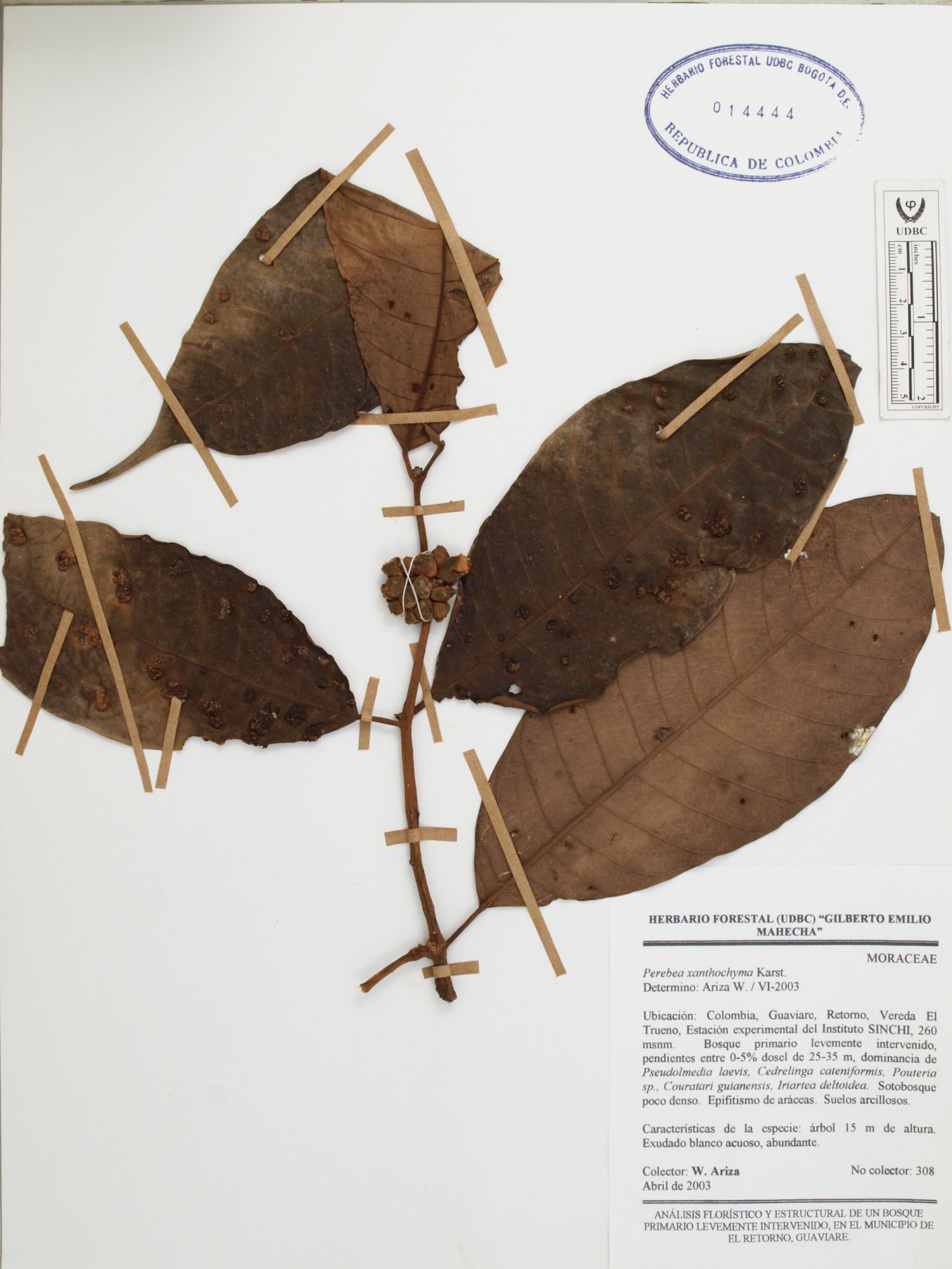 Fotografía del ejemplar Ariza, W. 308, determinado como Perebea xanthochyma en el año 2003