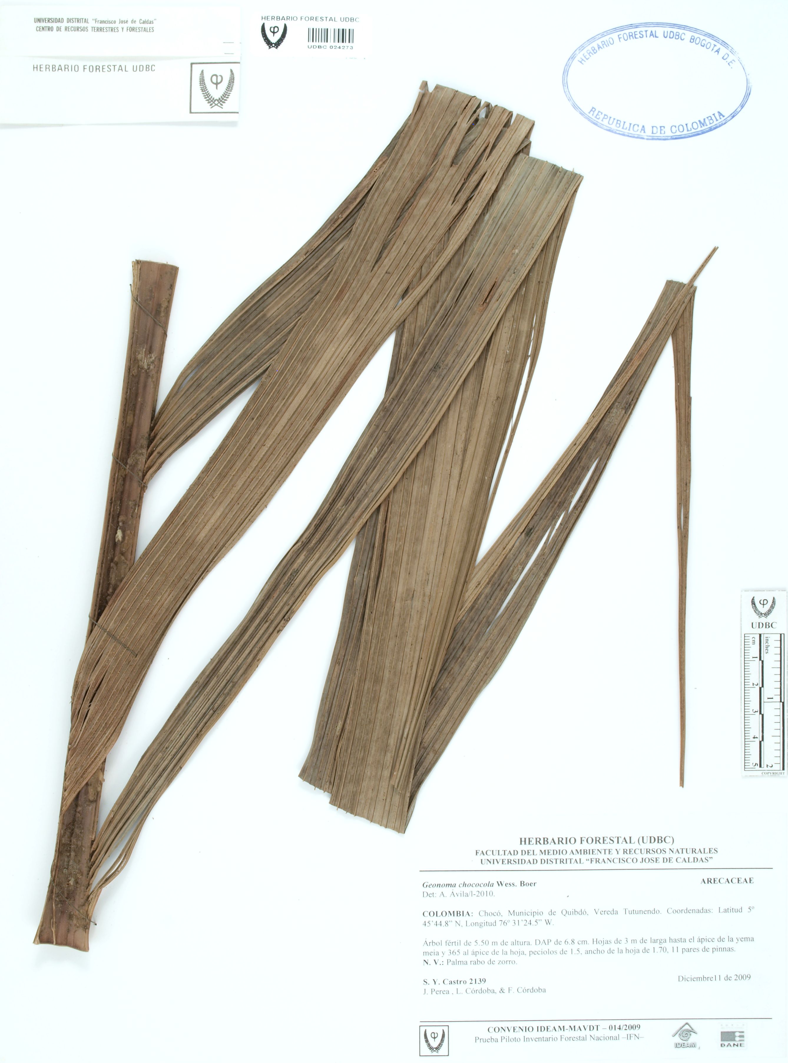 Fotografía del ejemplar Castro, S. 2139, determinado como Geonoma chococola en el año 2010