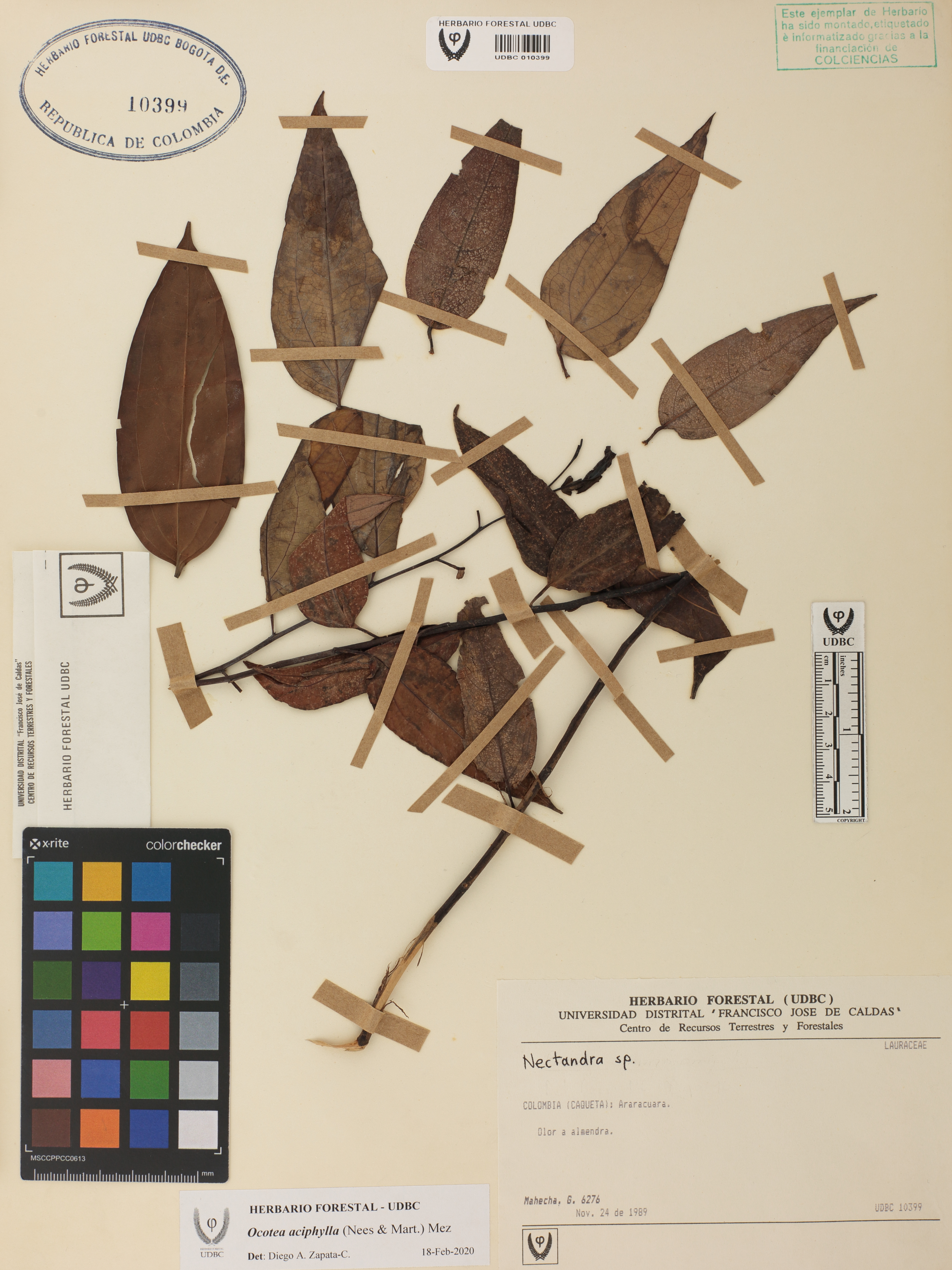 Fotografía del ejemplar Mahecha, G. 6276, determinado como Ocotea aciphylla en el año 2020
