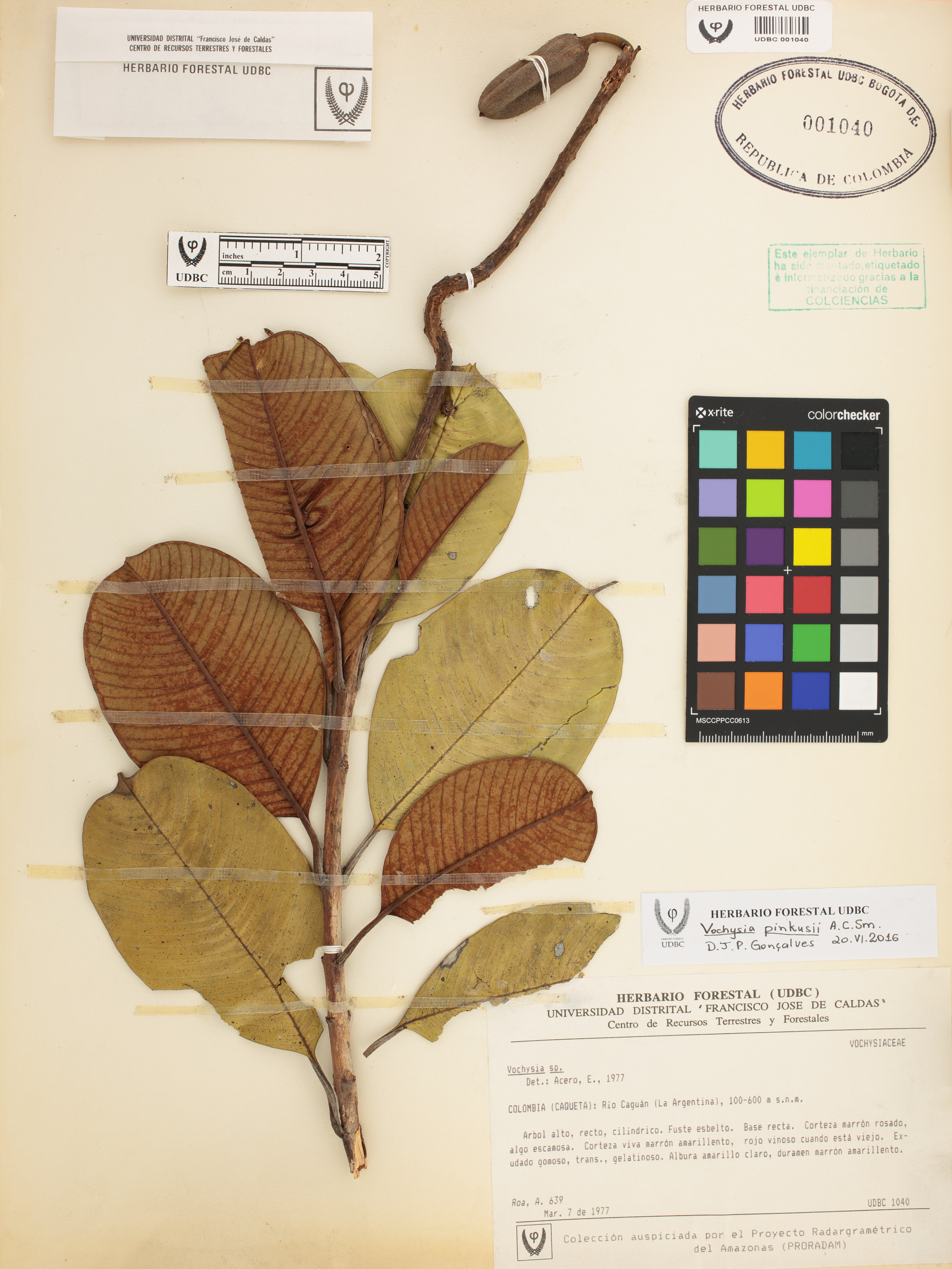 Fotografía del ejemplar Roa, A. 639, determinado como Vochysia pinkusii en el año 2016