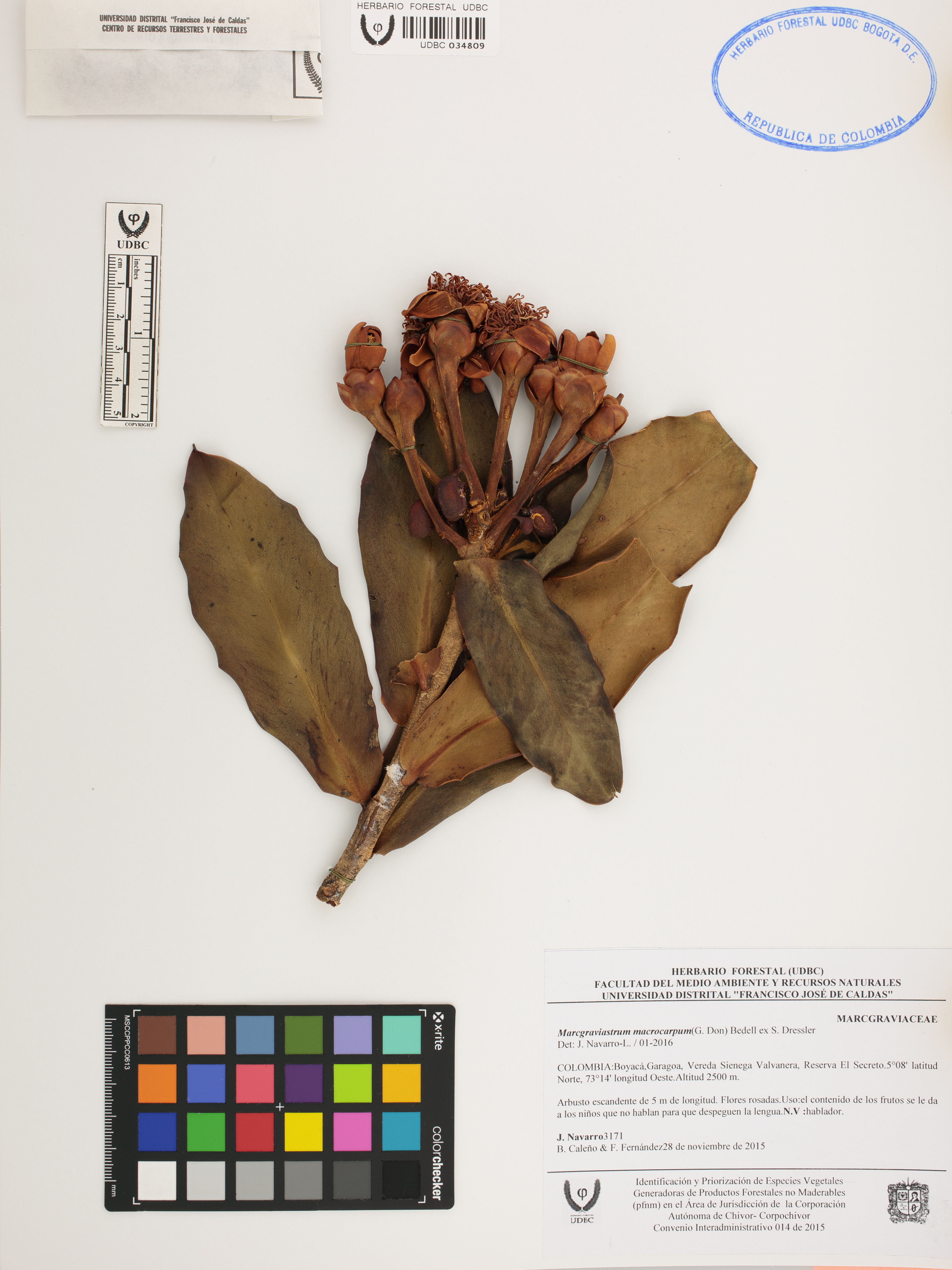 Fotografía del ejemplar Navarro, J. 3171, determinado como Marcgraviastrum macrocarpum en el año 2016