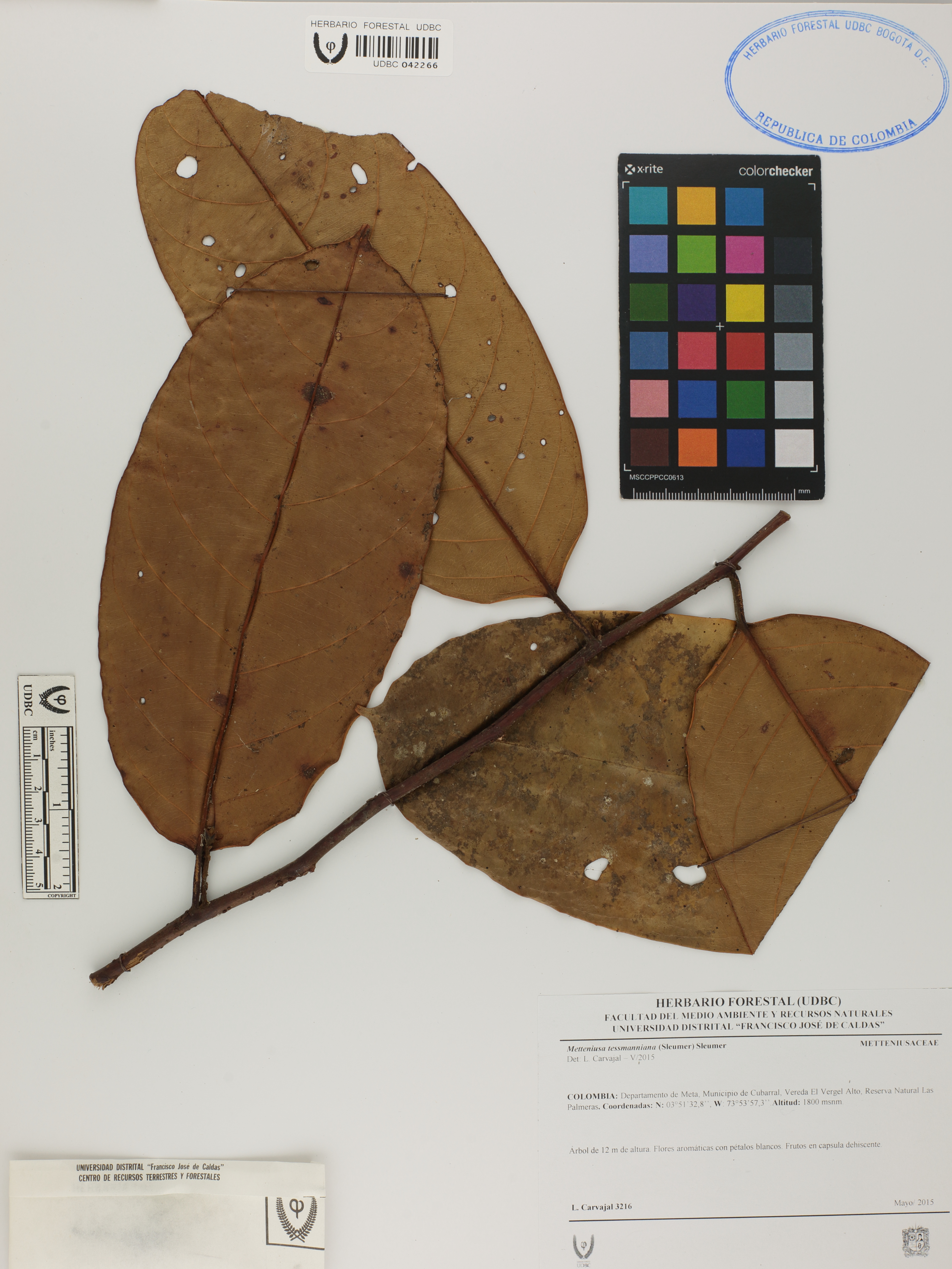 Fotografía del ejemplar Carvajal, L. 3216, determinado como Metteniusa tessmanniana en el año 2015
