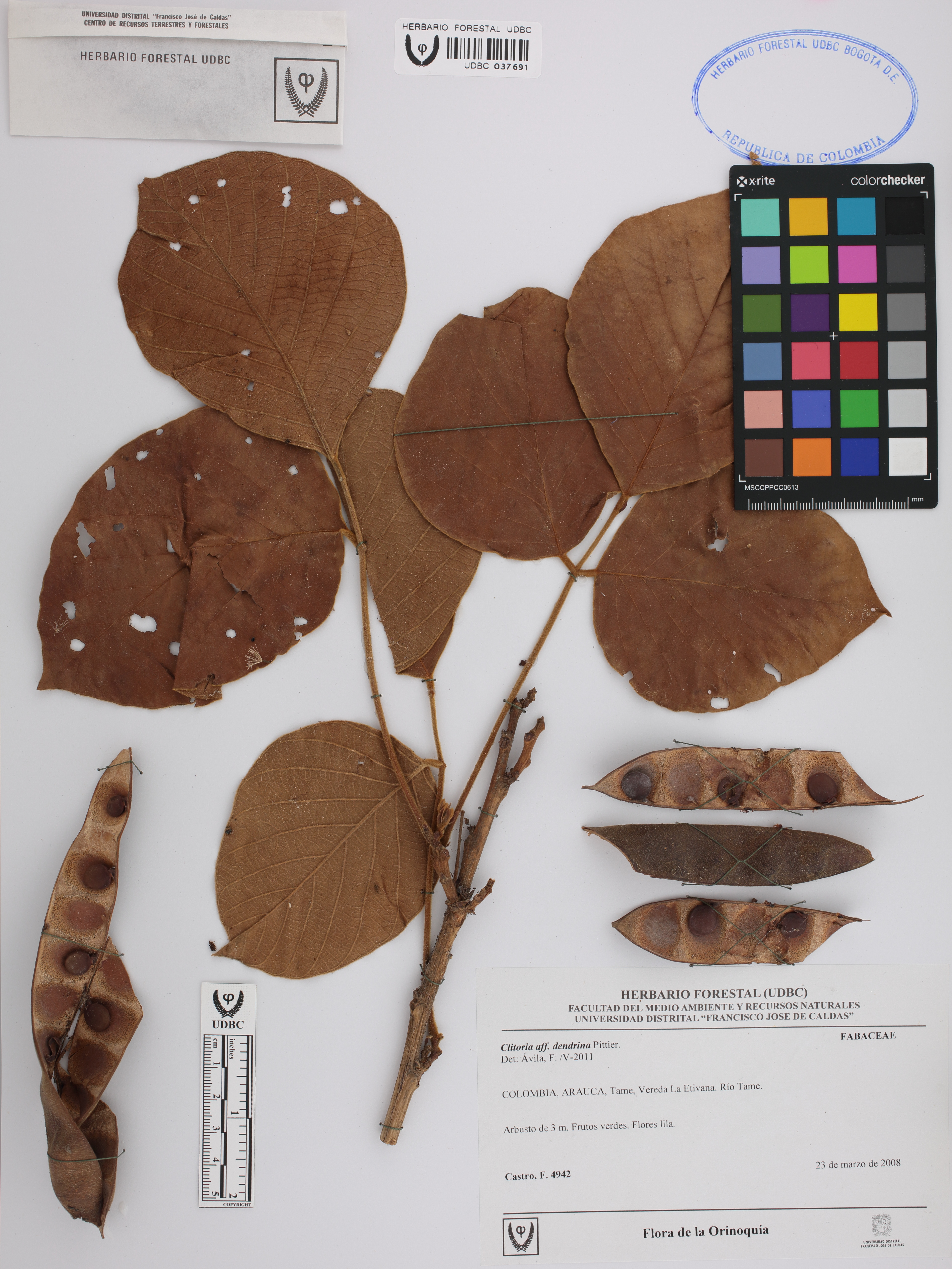 Fotografía del ejemplar Castro, F. 4942, determinado como Clitoria dendrina en el año 2011