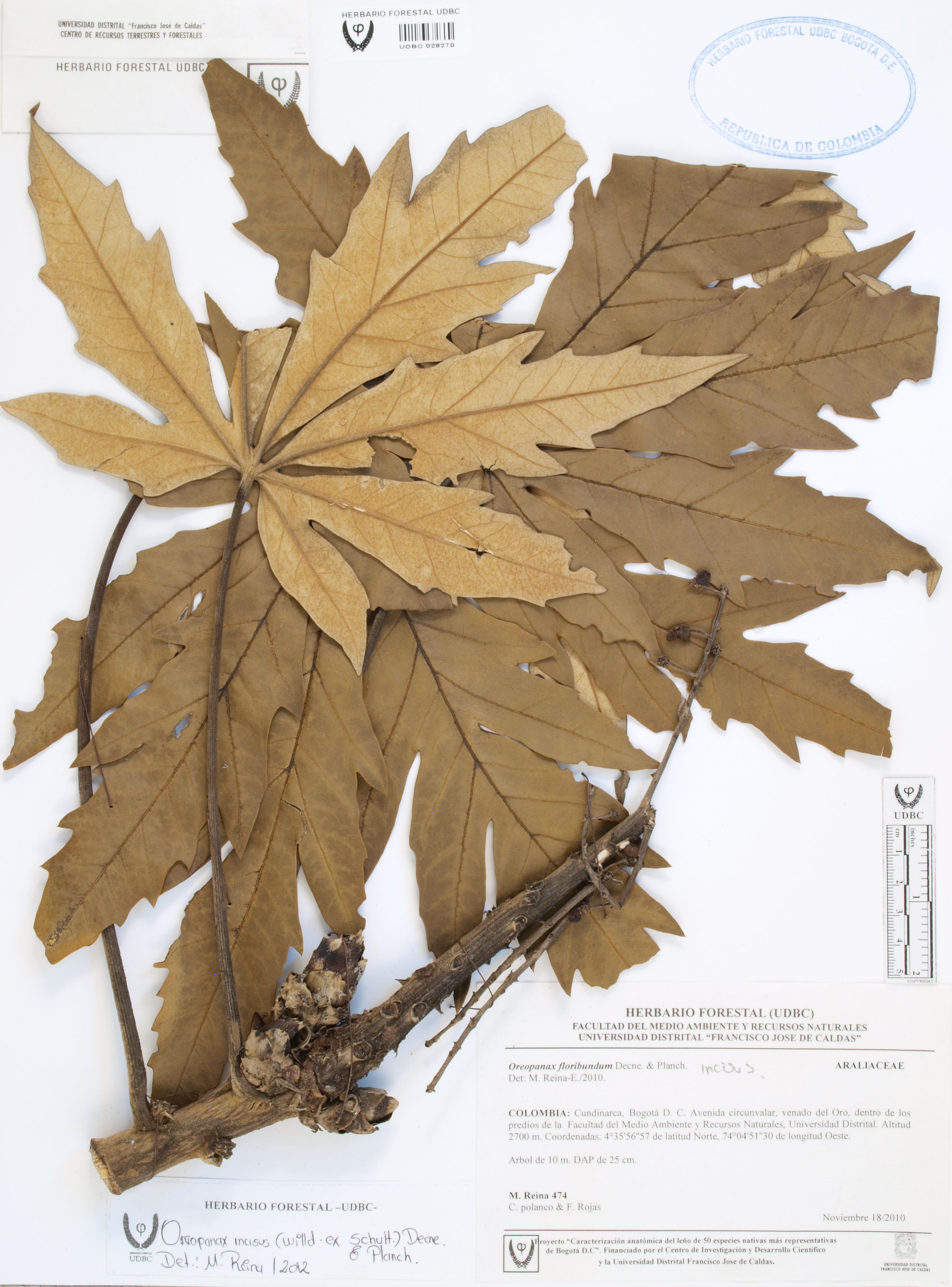 Fotografía del ejemplar Reina, M. 474, determinado como Oreopanax incisus en el año 2012