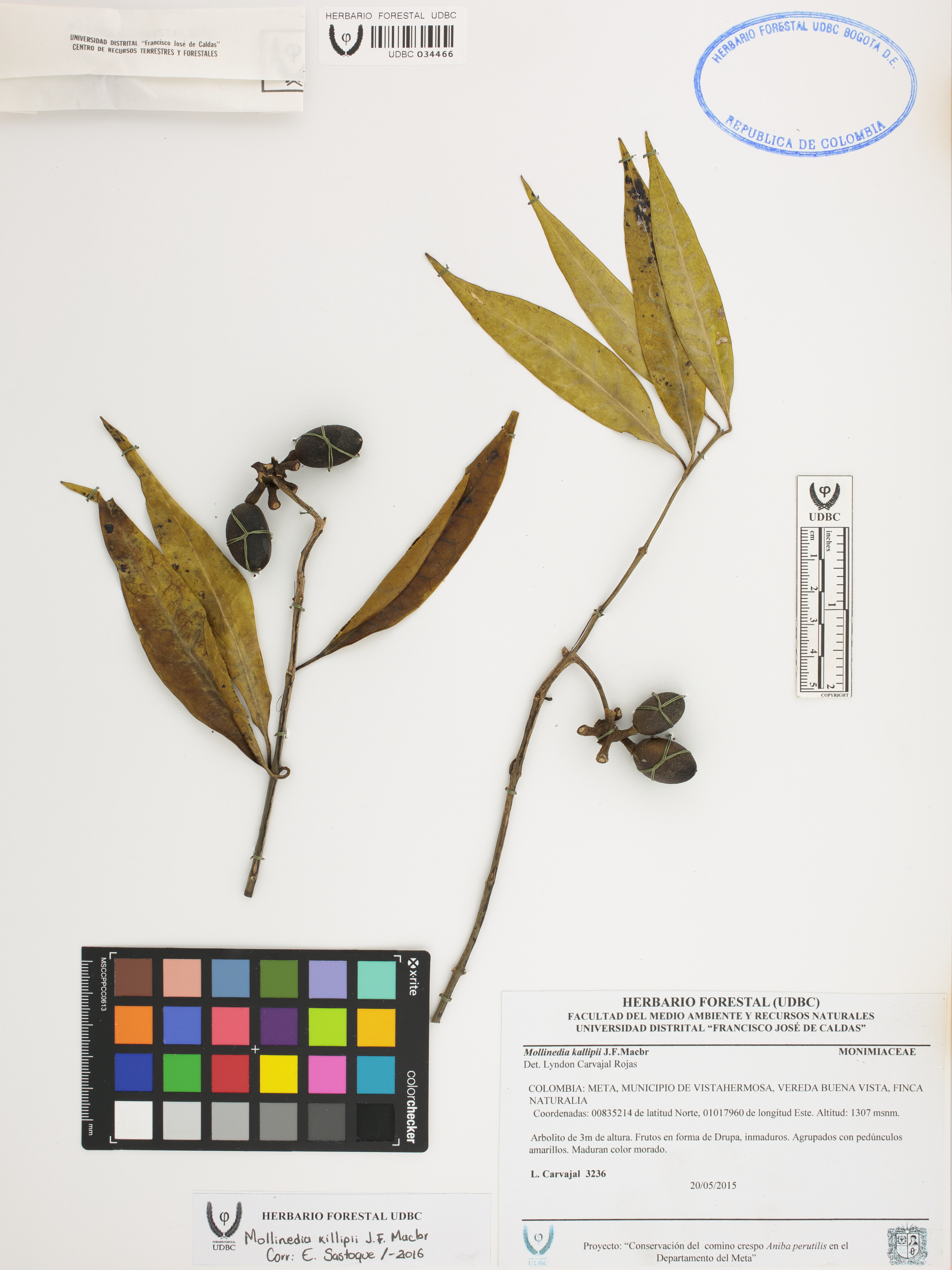 Fotografía del ejemplar Carvajal, L. 3236, determinado como Mollinedia killipii en el año 2016
