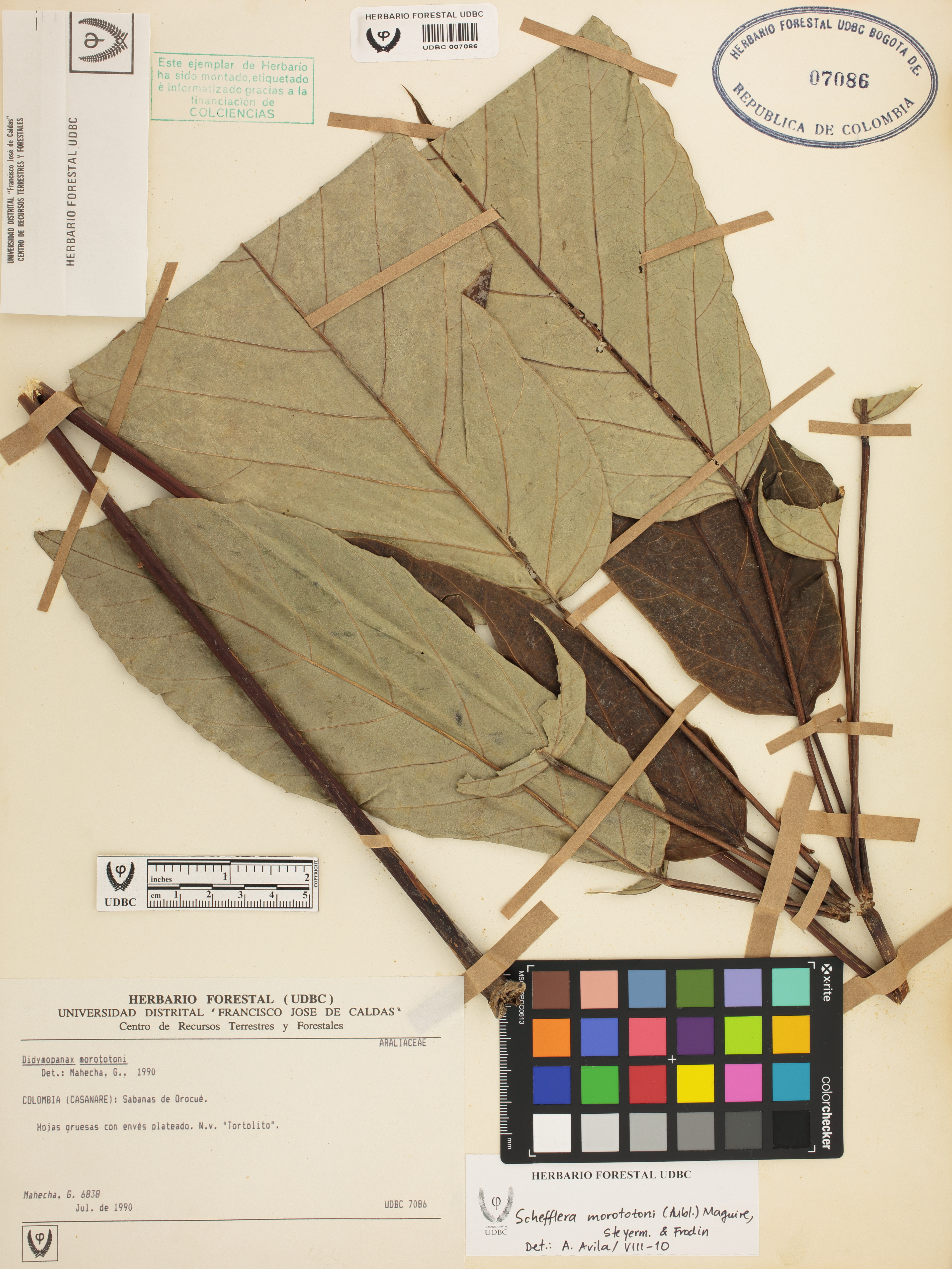 Fotografía del ejemplar Mahecha, G. 6838, determinado como Didymopanax morototoni en el año 2010