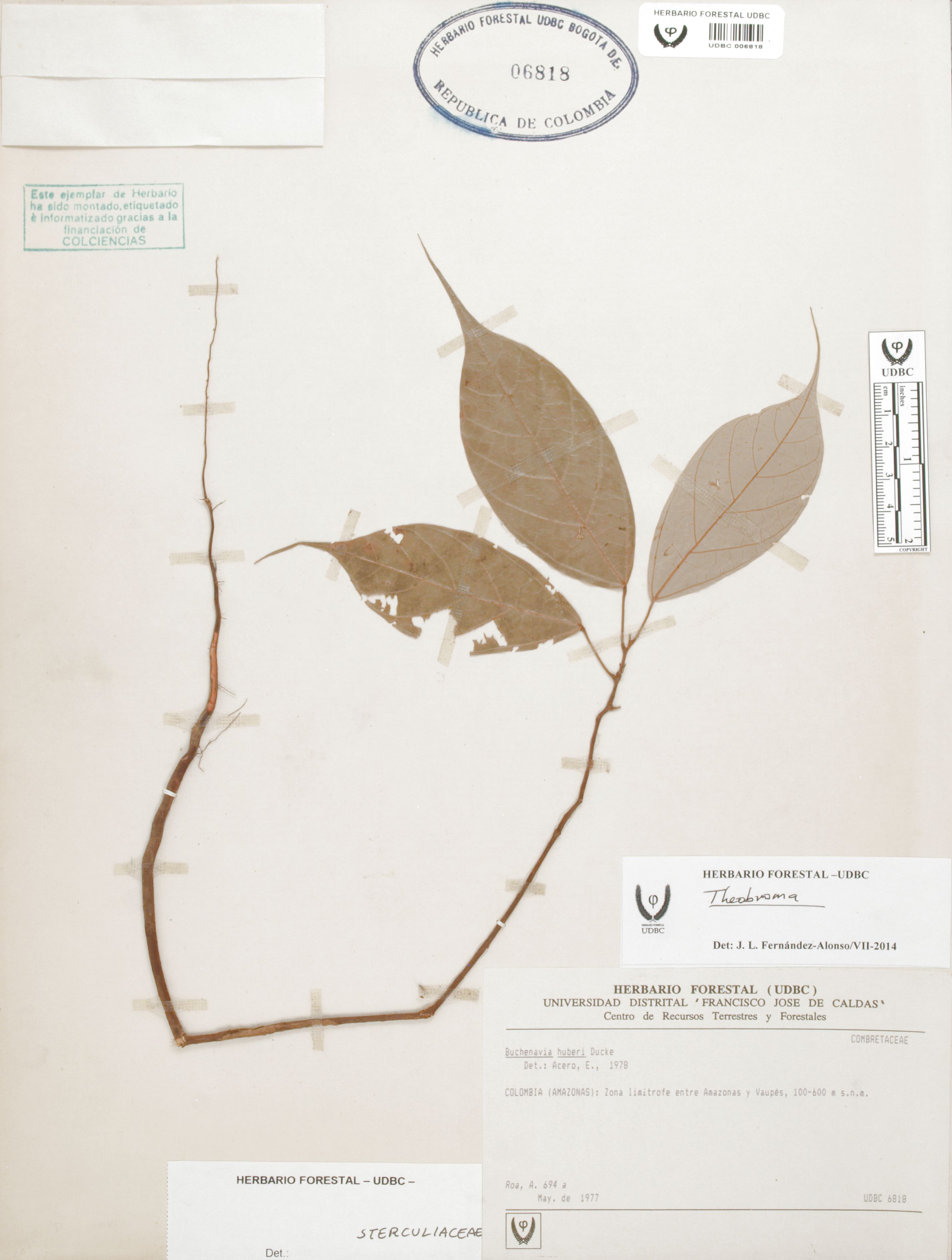 Fotografía del ejemplar Roa, A. 694, determinado como Theobroma sp. en el año 2014