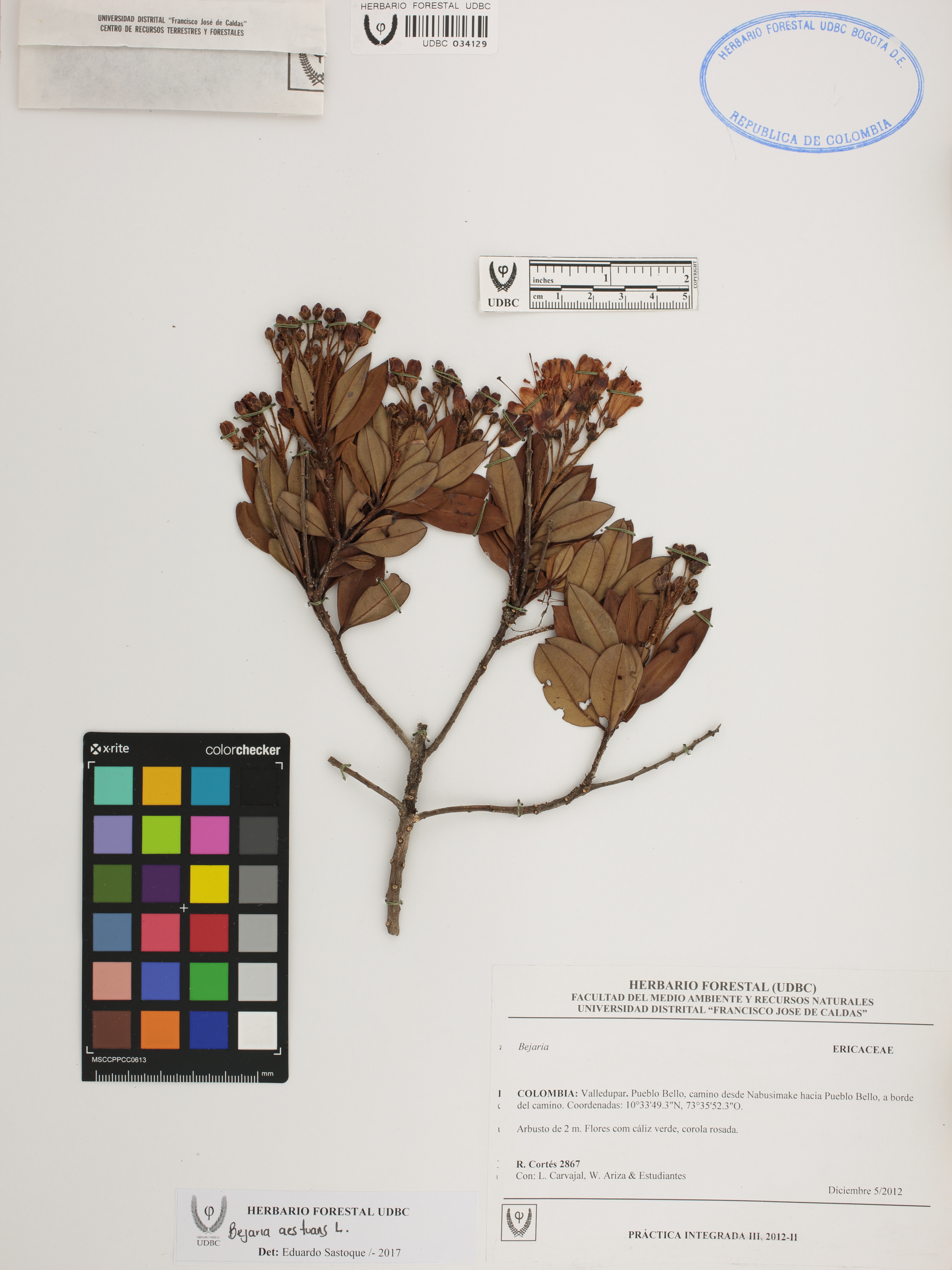 Fotografía del ejemplar Cortés, R. 2867, determinado como Bejaria aestuans en el año 2017