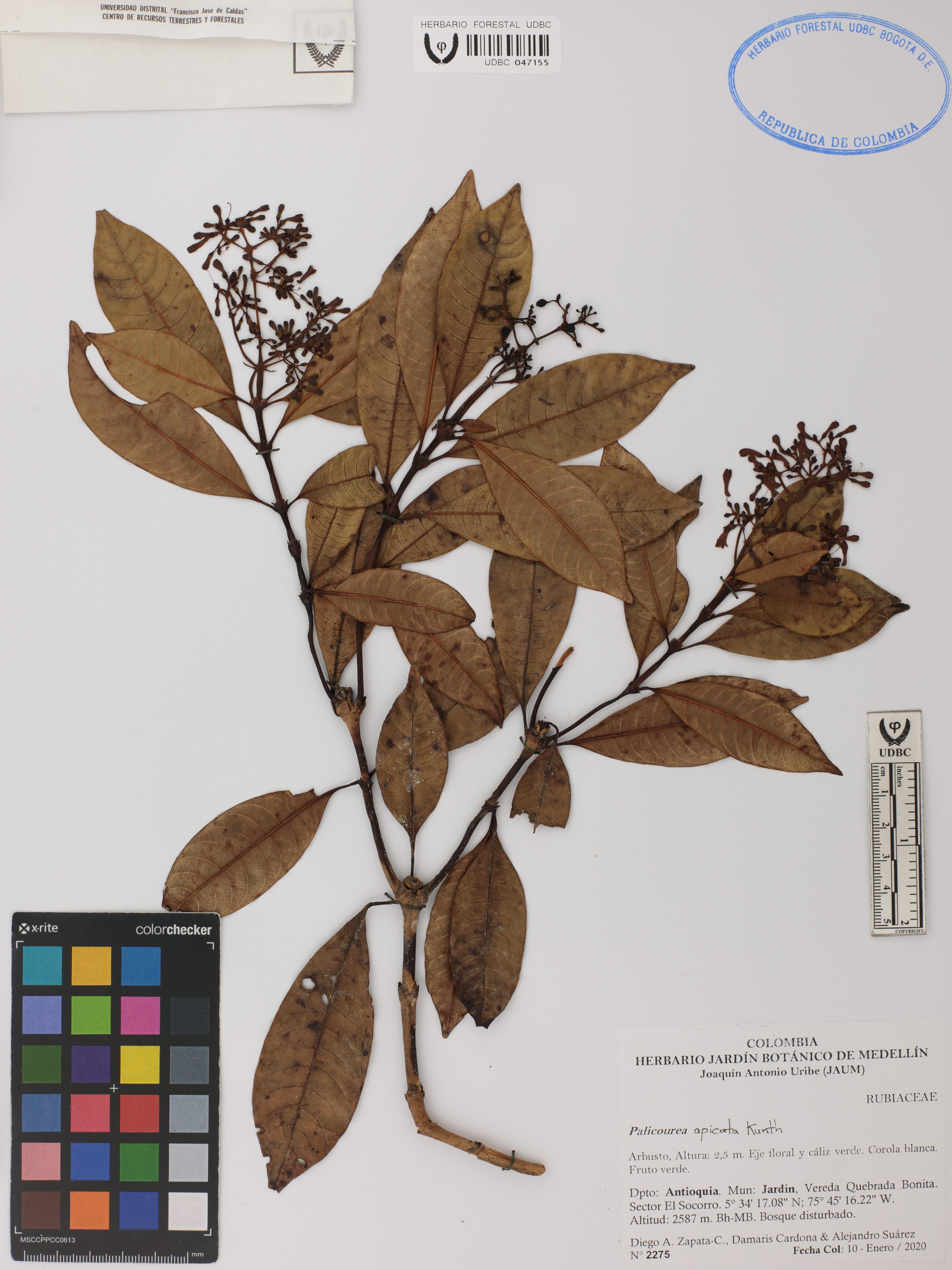 Fotografía del ejemplar Zapata-C., D. 2275, determinado como Palicourea apicata en el año 2021