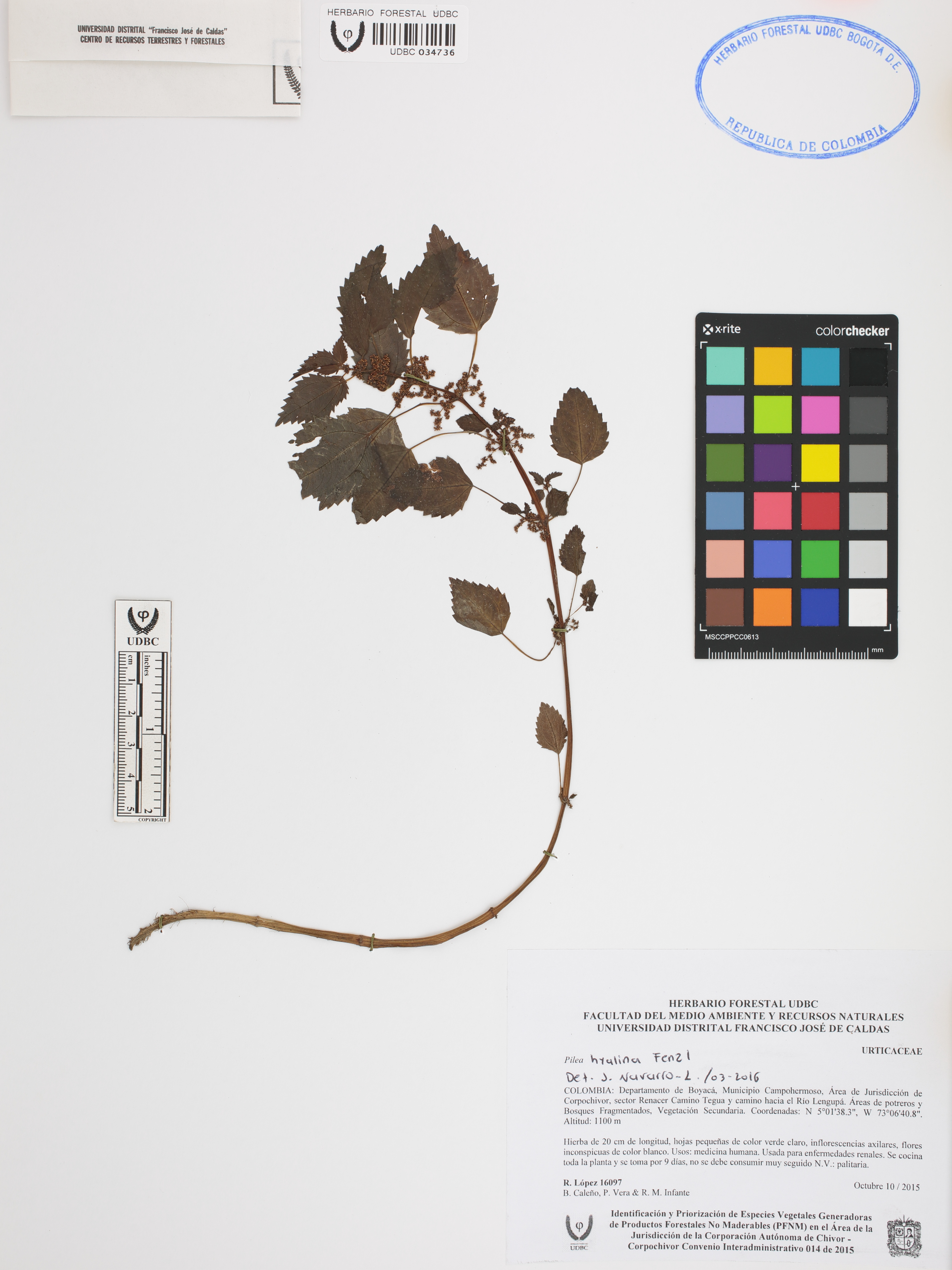 Fotografía del ejemplar López, R. 16097, determinado como Pilea hyalina en el año 2016