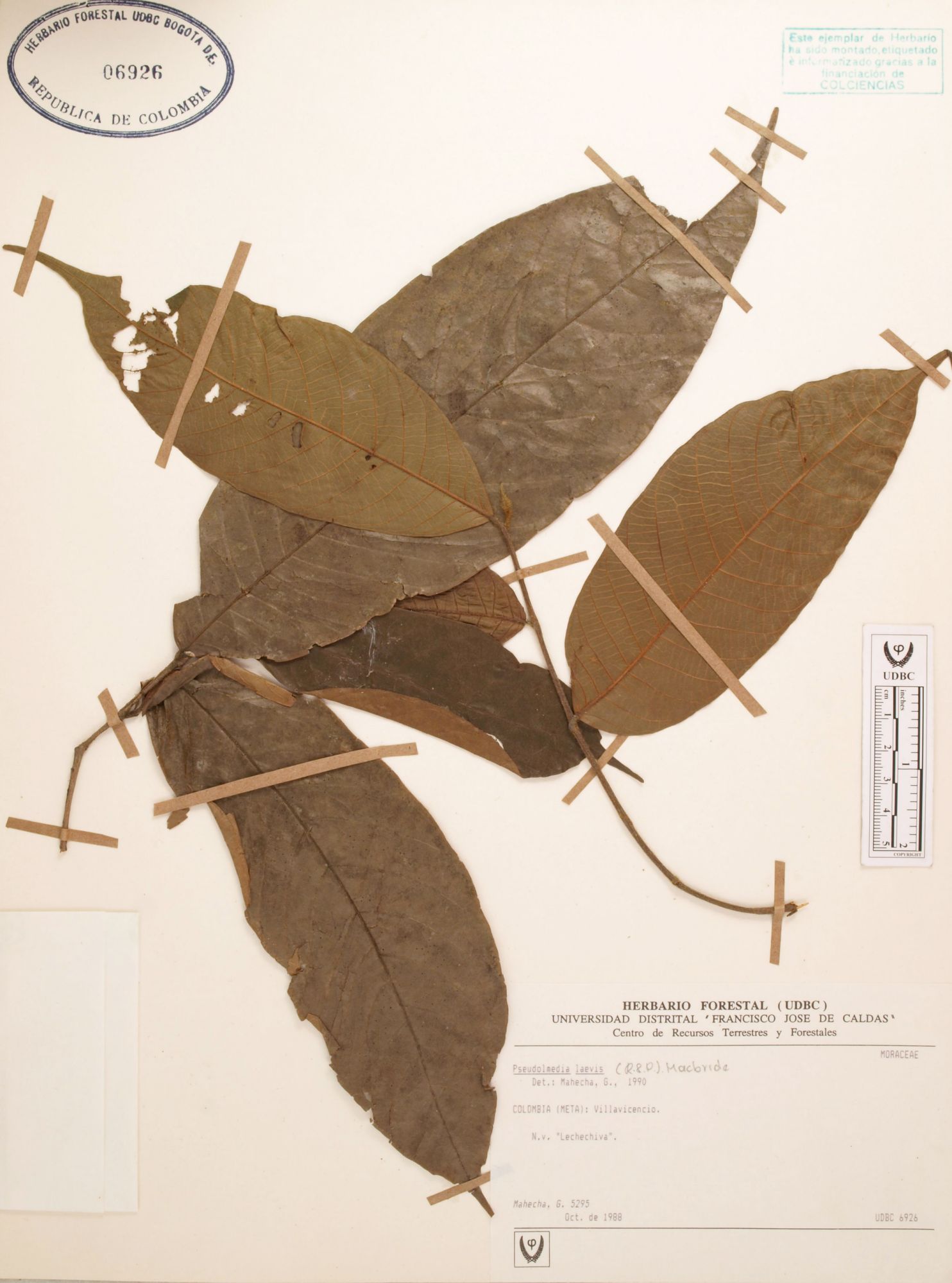 Fotografía del ejemplar Mahecha, G. 5295, determinado como Pseudolmedia laevis en el año 1990