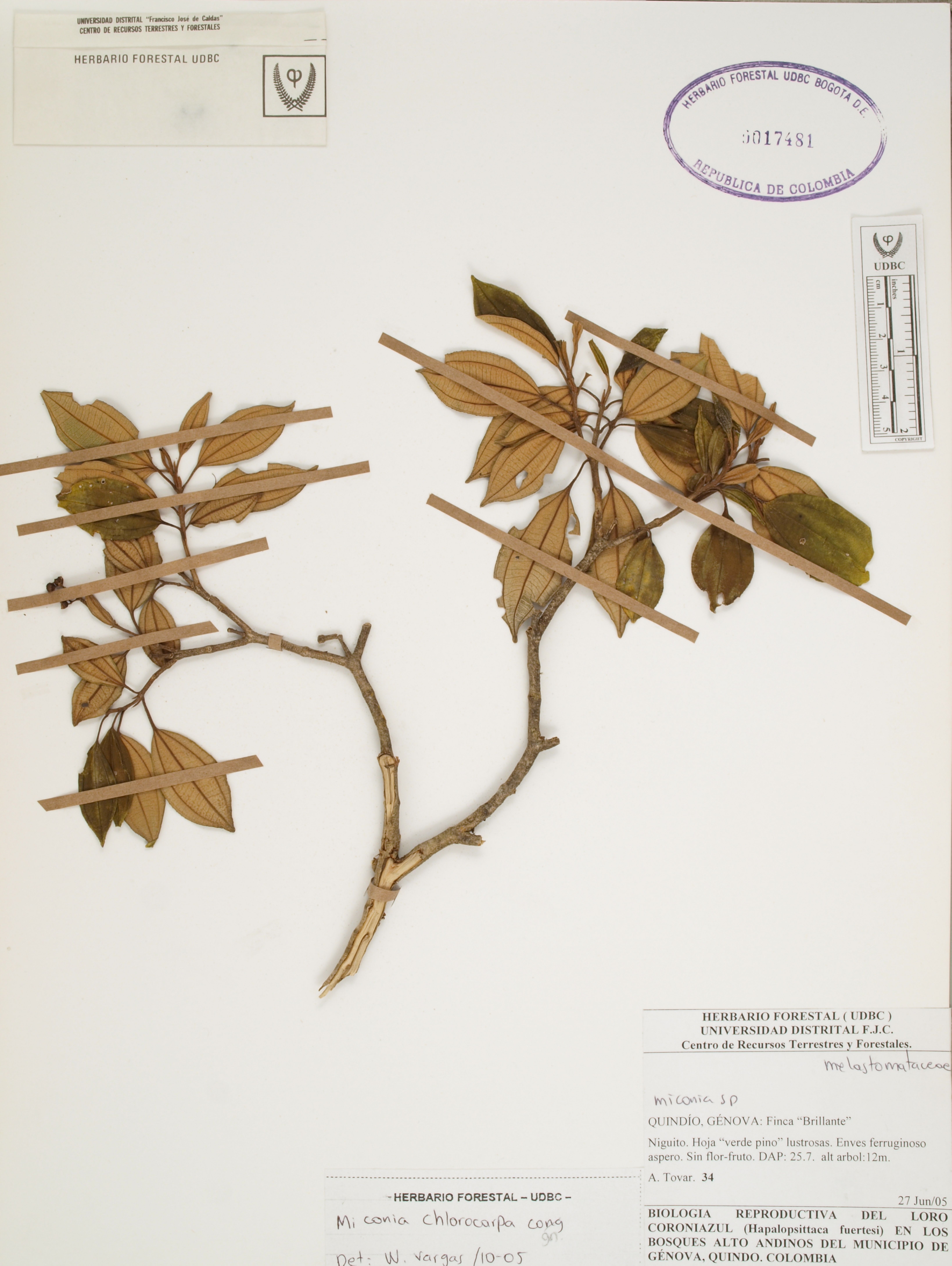 Fotografía del ejemplar Tovar, A. 34, determinado como Miconia chlorocarpa en el año 2005
