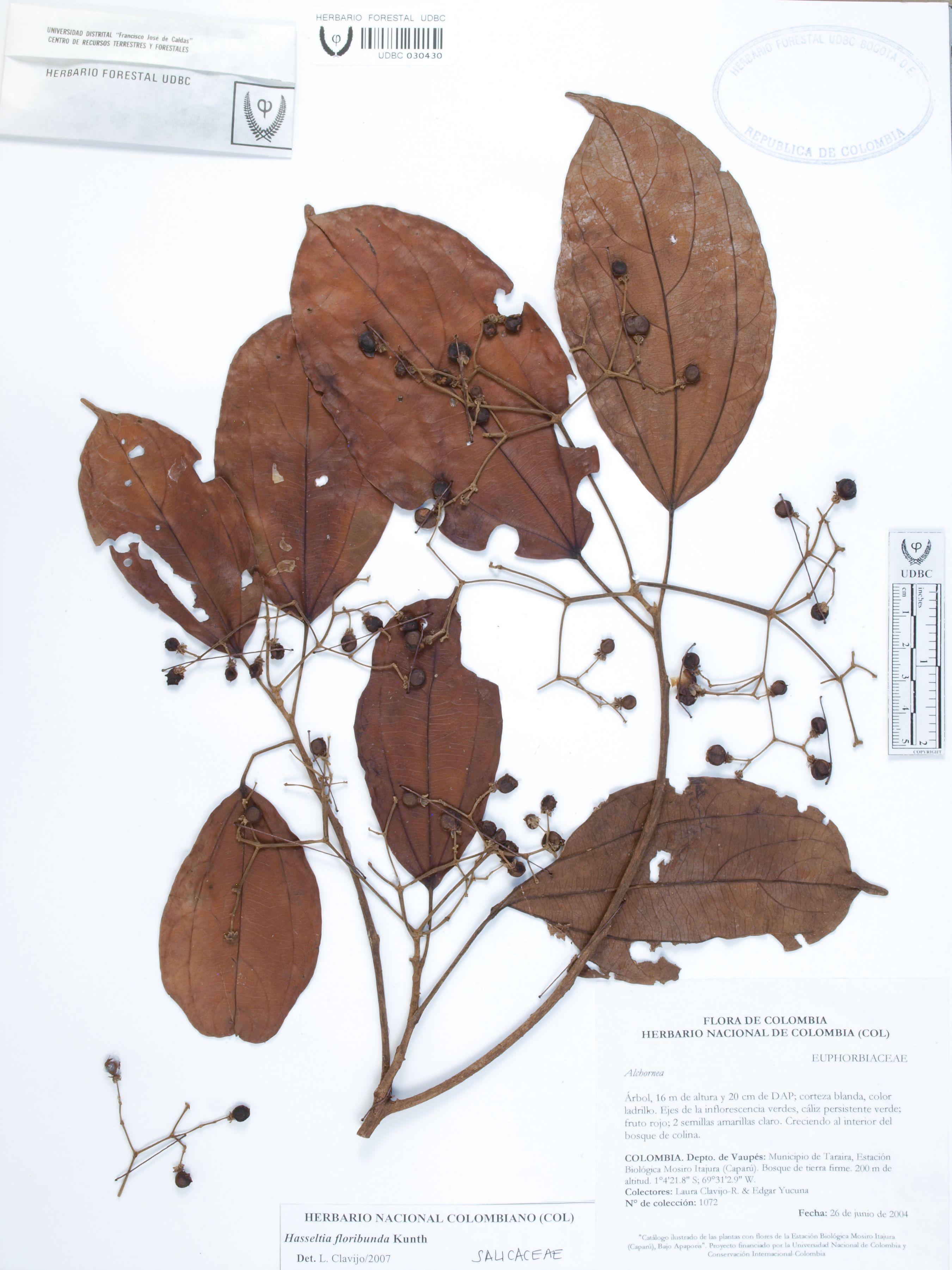 Fotografía del ejemplar Clavijo-R., L. 1072, determinado como Hasseltia floribunda en el año 2007