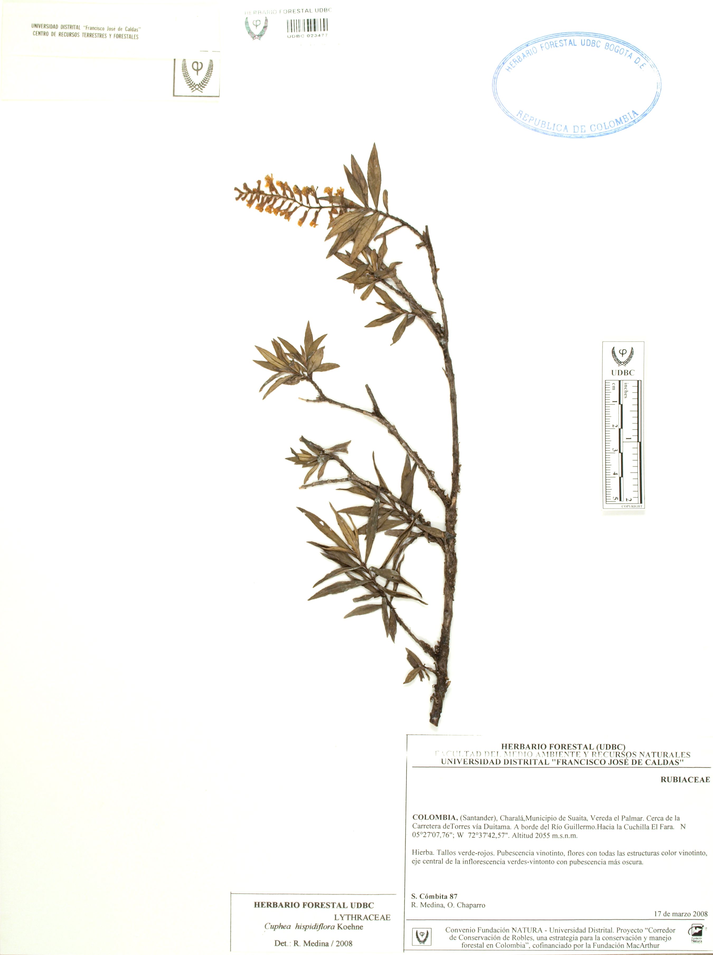Fotografía del ejemplar Cómbita, S. 87, determinado como Cuphea hispidiflora en el año 2008