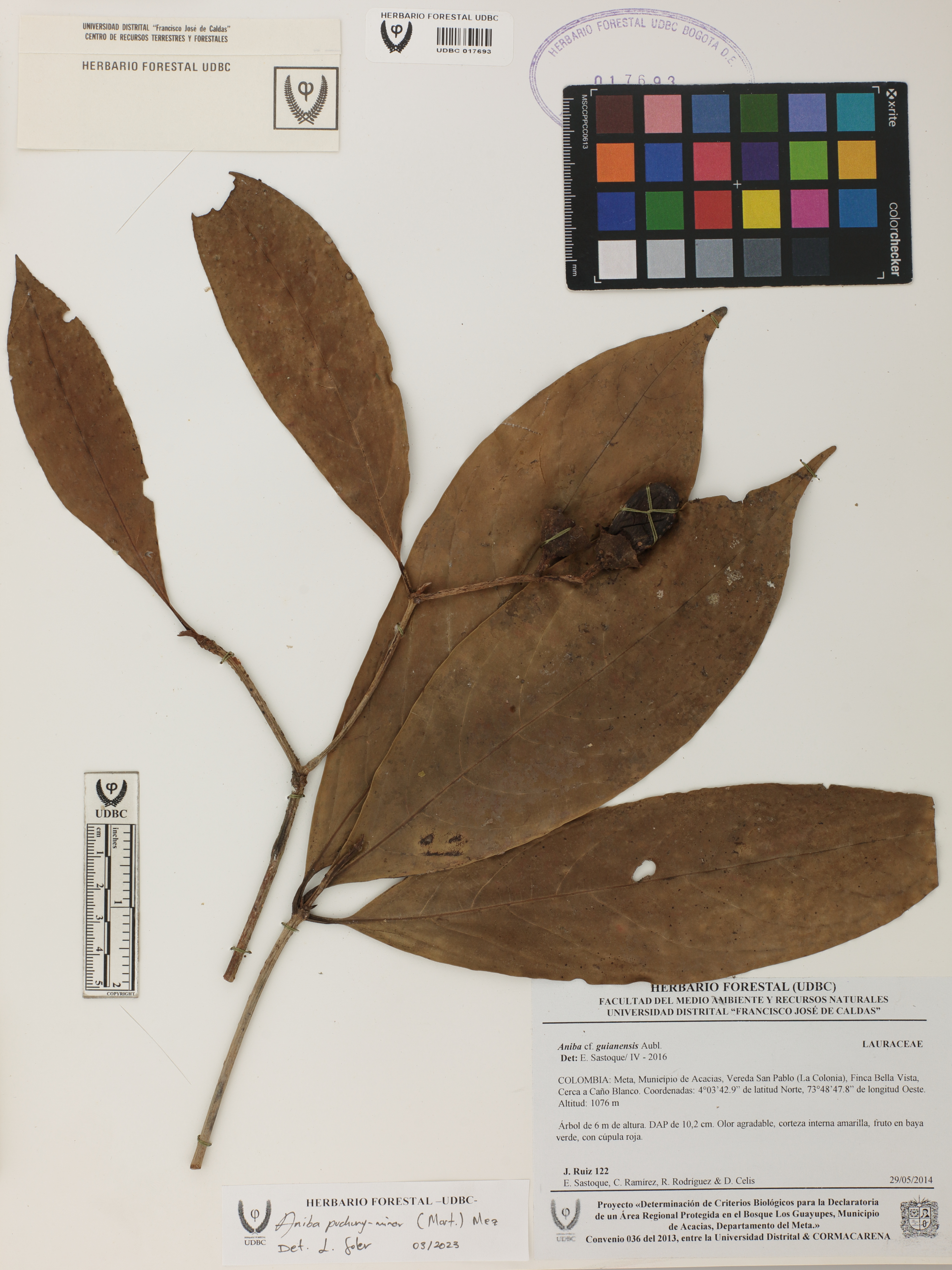 Fotografía del ejemplar Ruiz, J. 122, determinado como Aniba puchury-minor en el año 2023