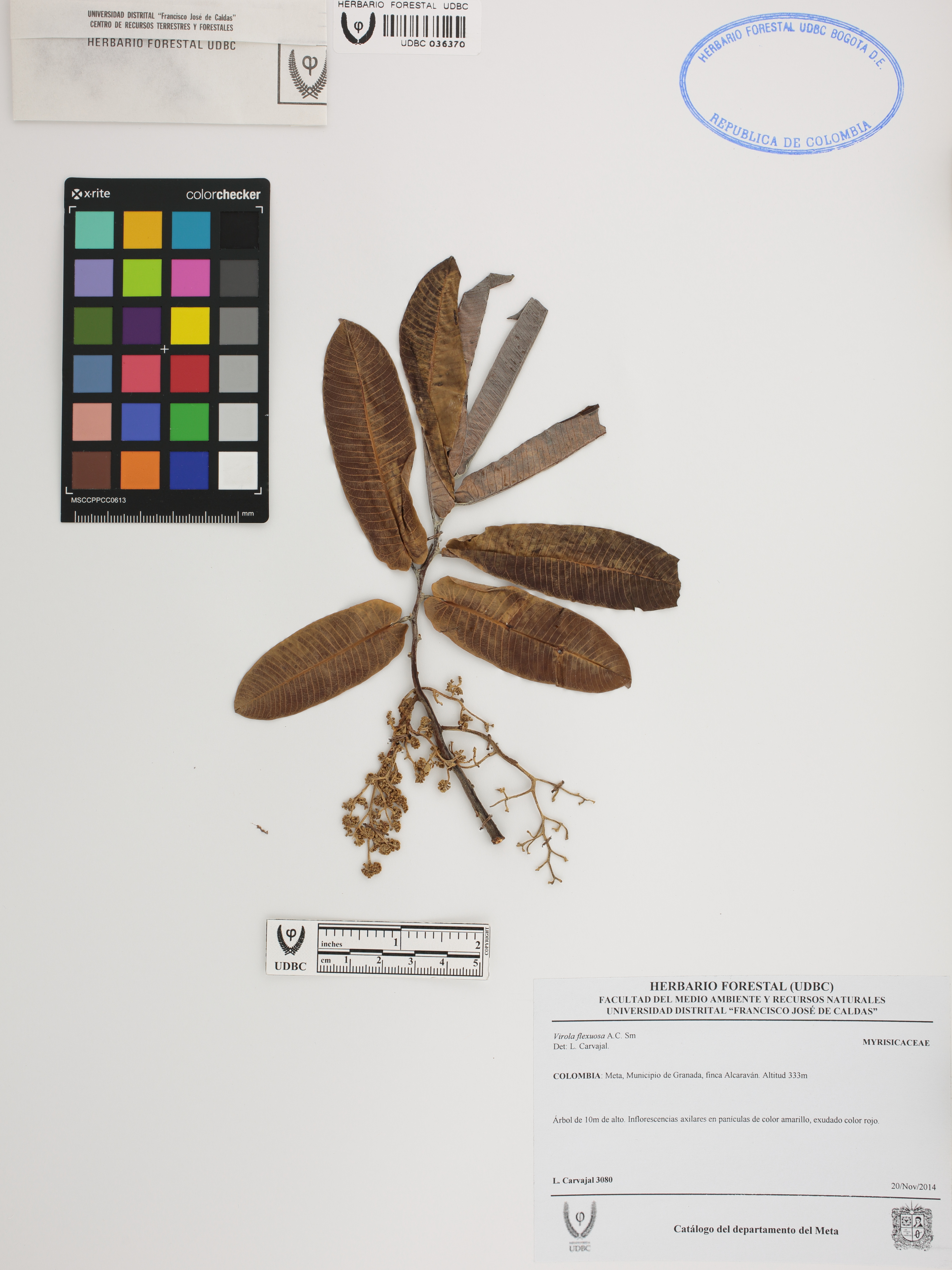 Fotografía del ejemplar Carvajal, L. 3080, determinado como Virola flexuosa