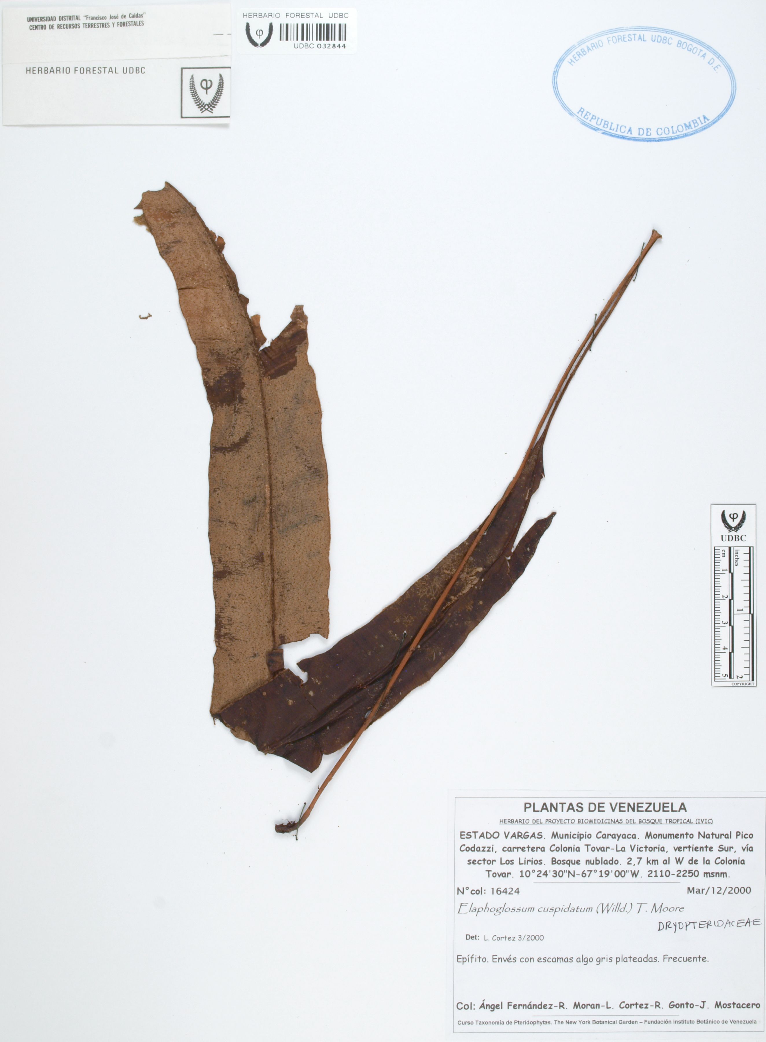 Fotografía del ejemplar Fernández, A. 16424, determinado como Elaphoglossum cuspidatum en el año 2000