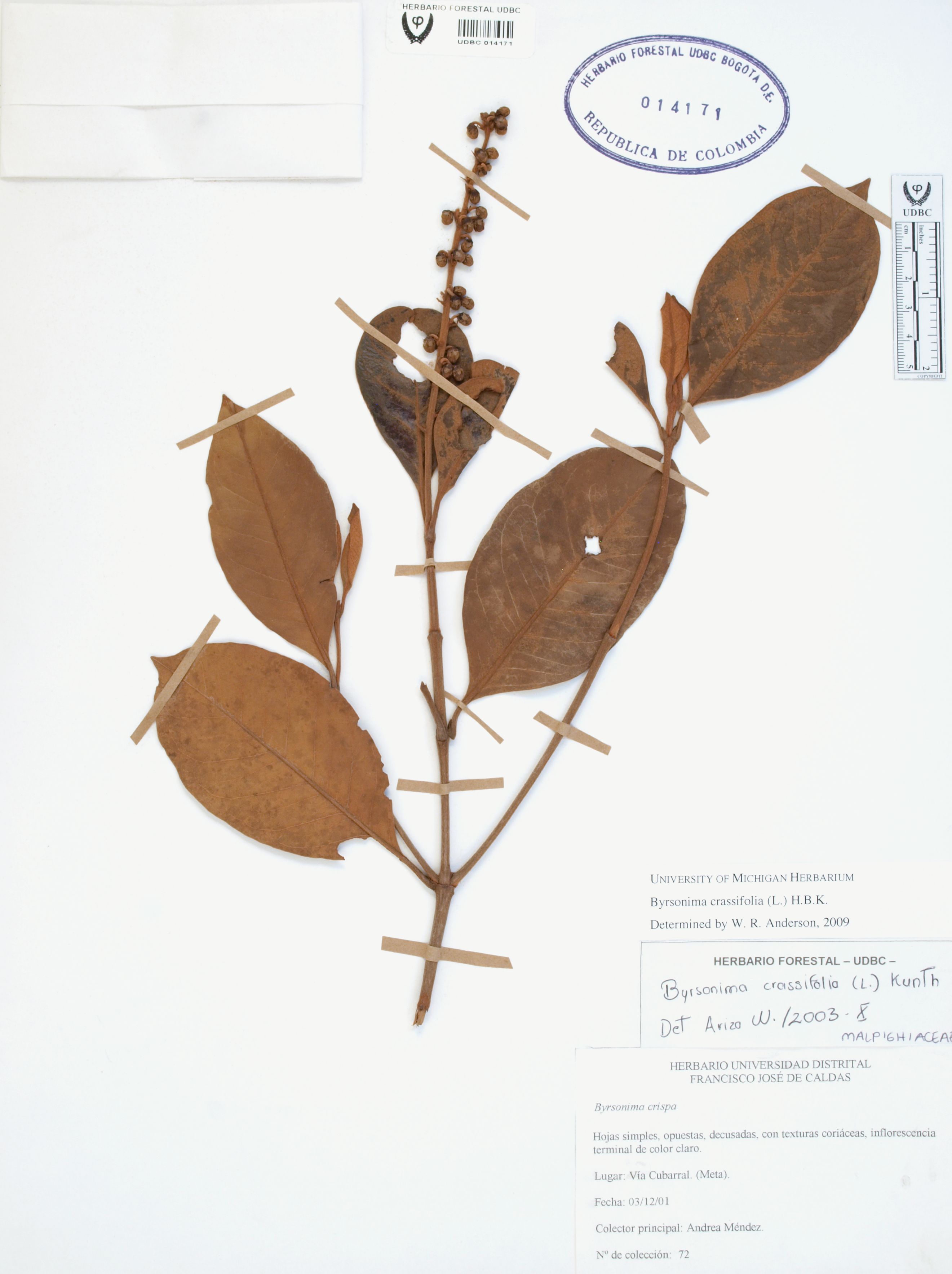 Fotografía del ejemplar Méndez, A. 72, determinado como Byrsonima crassifolia en el año 2009