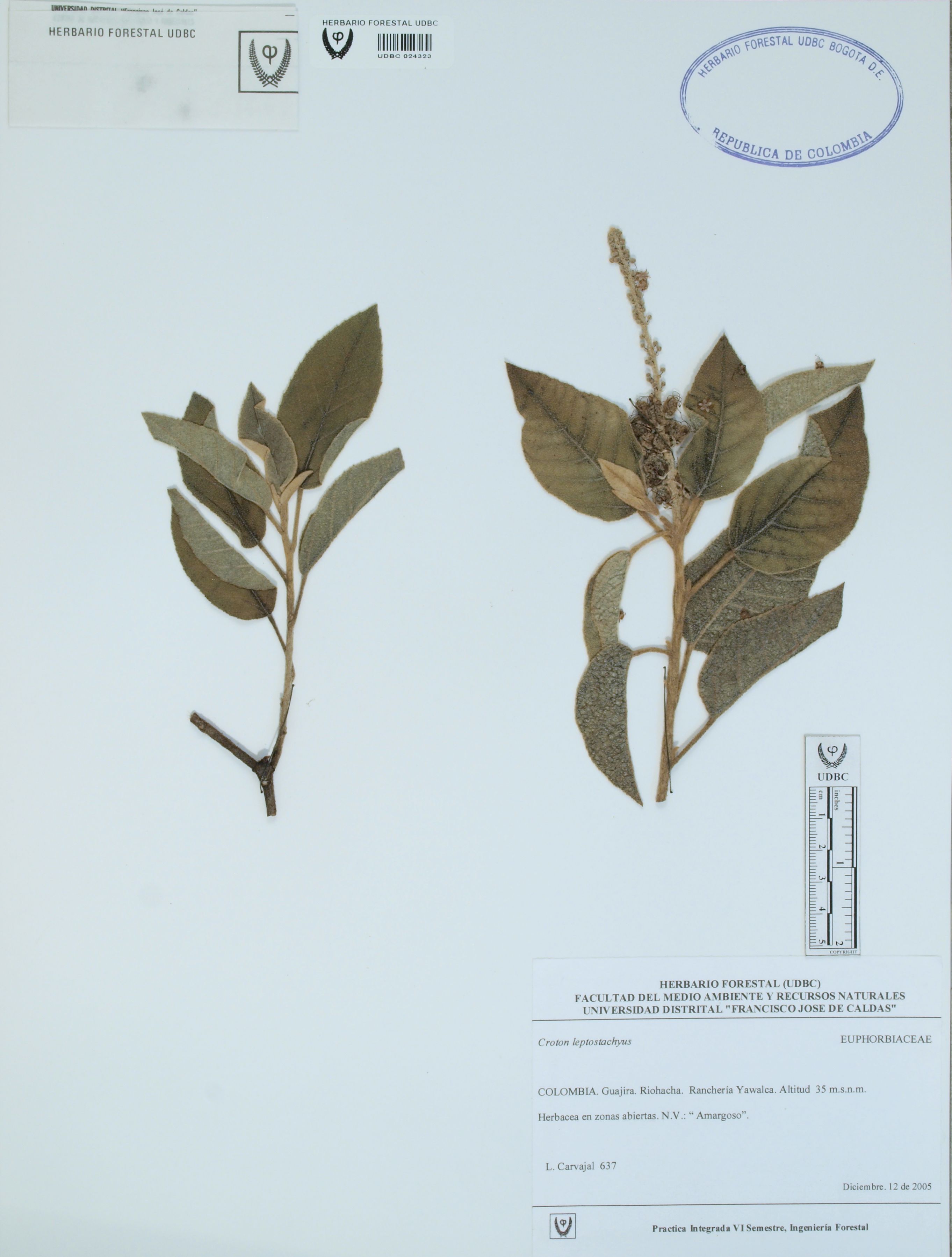 Fotografía del ejemplar Carvajal, L. 637, determinado como Croton leptostachyus