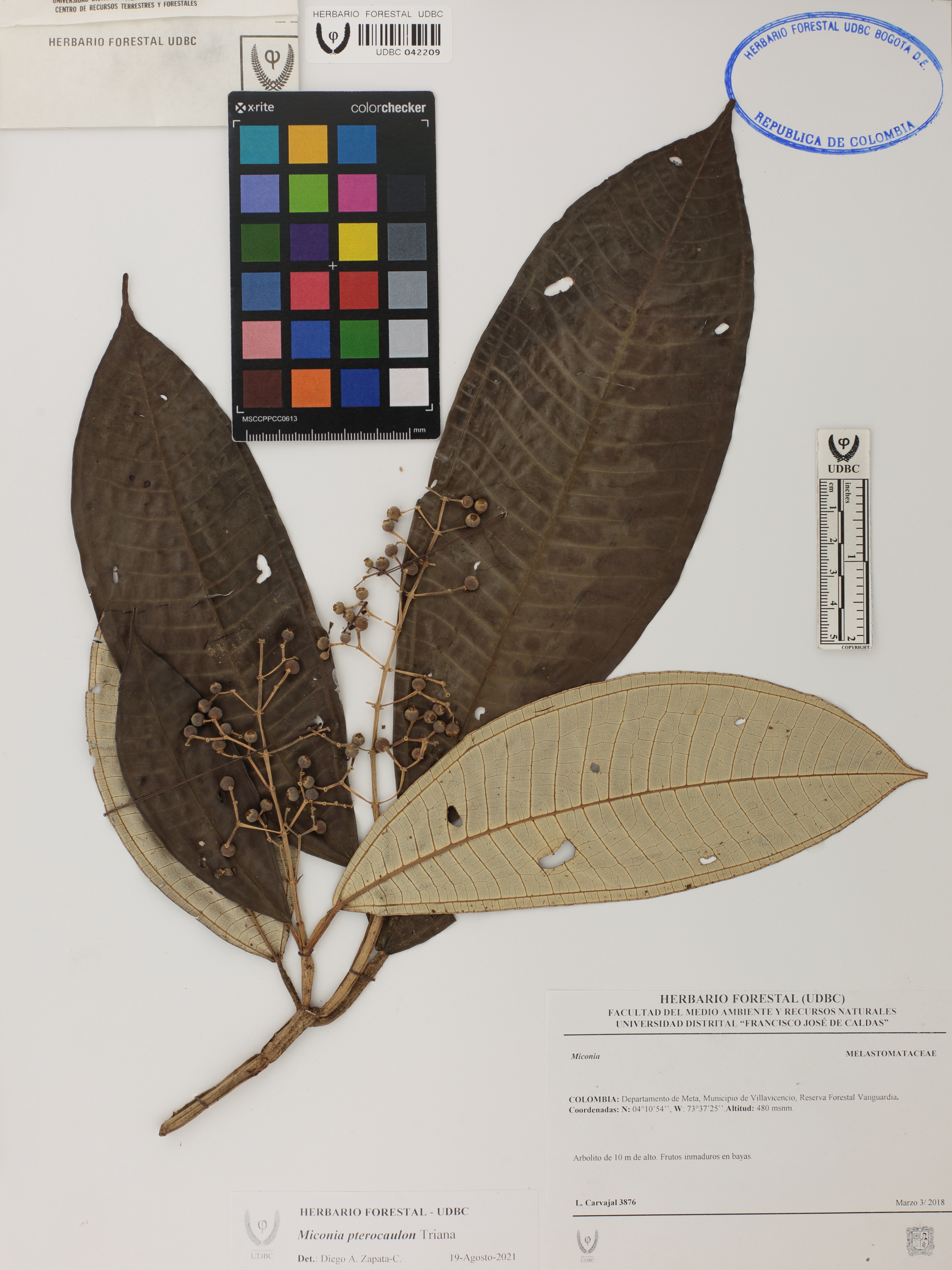 | dc.description | Fotografía del ejemplar Carvajal, L. 3876, determinado como Miconia pterocaulon en el año 2021 | |